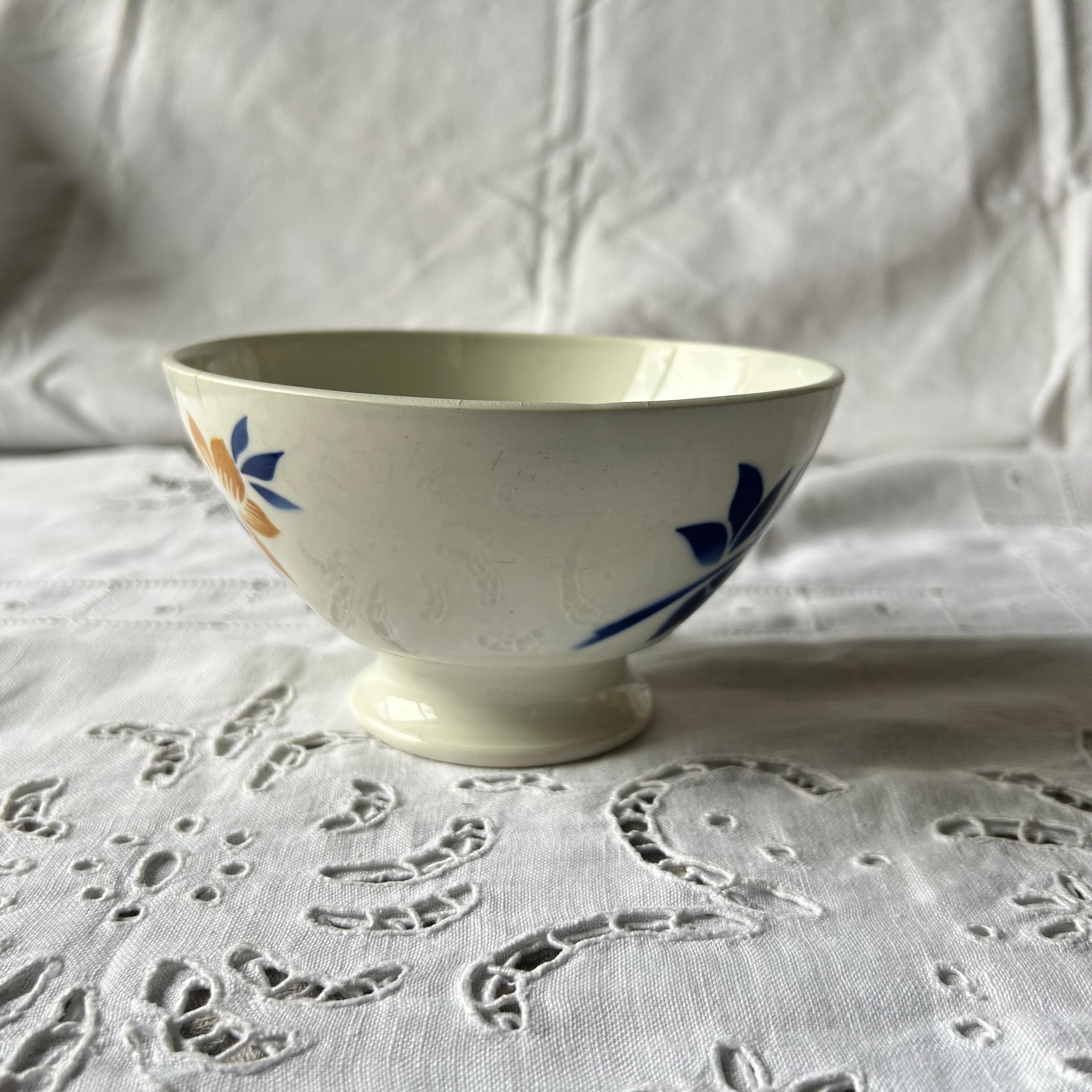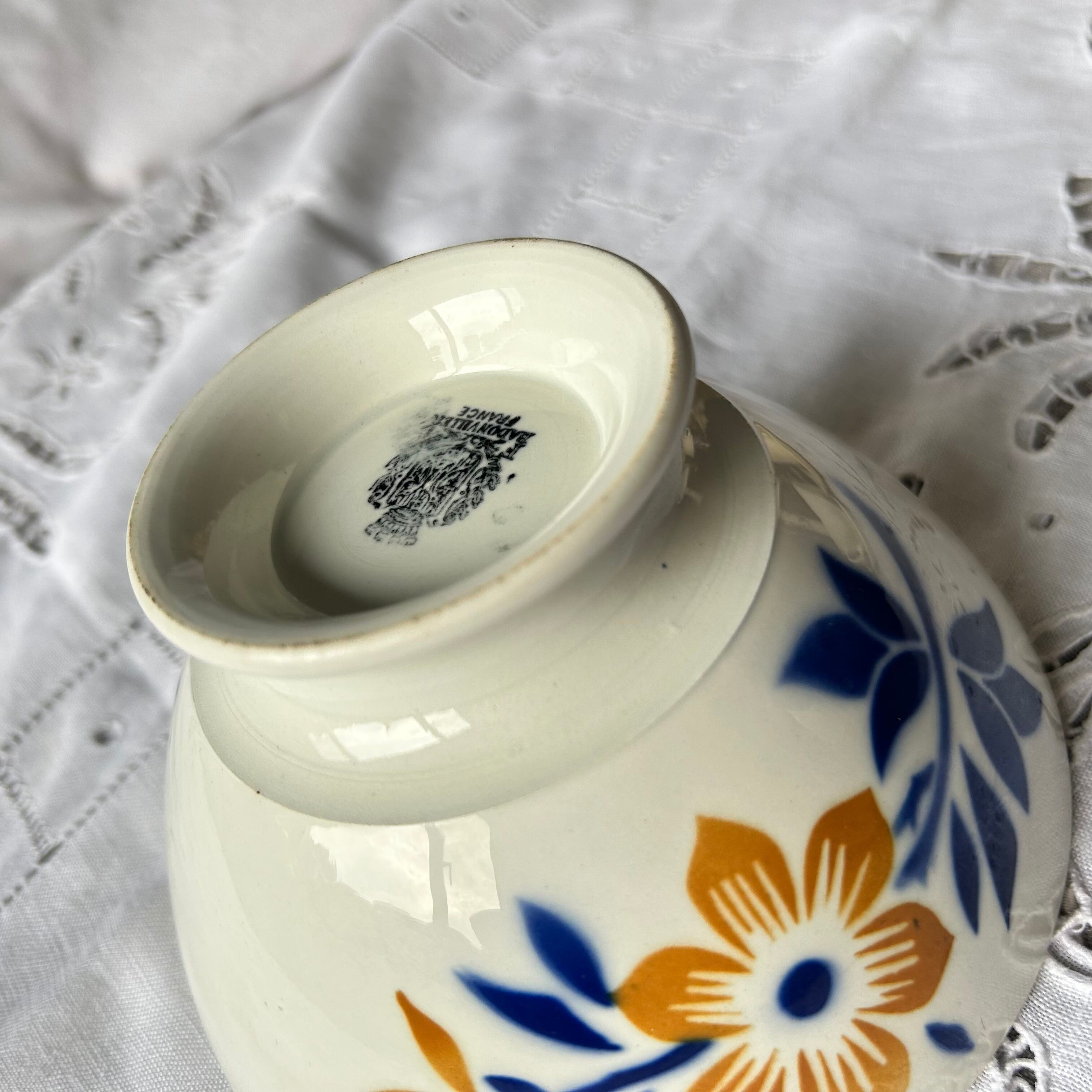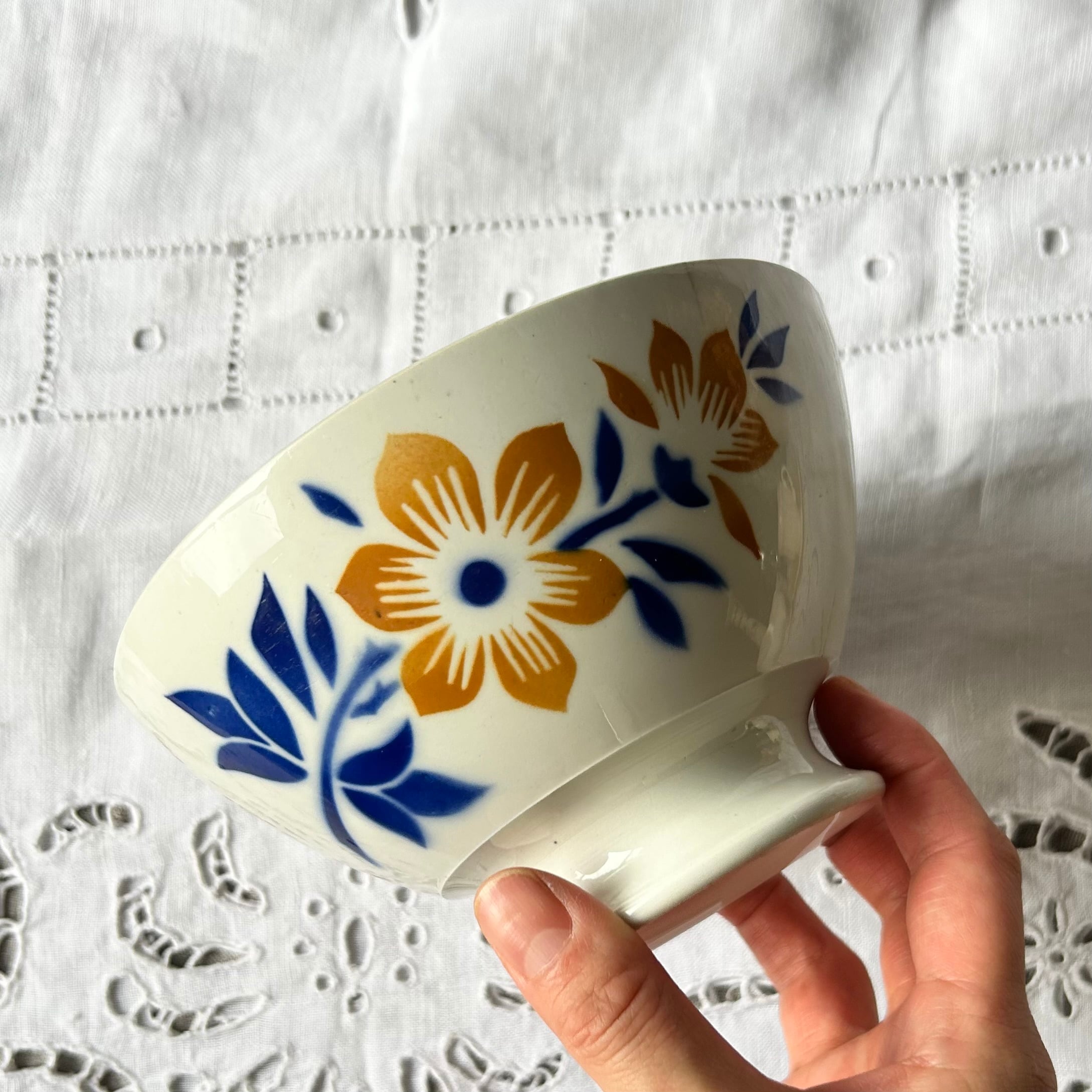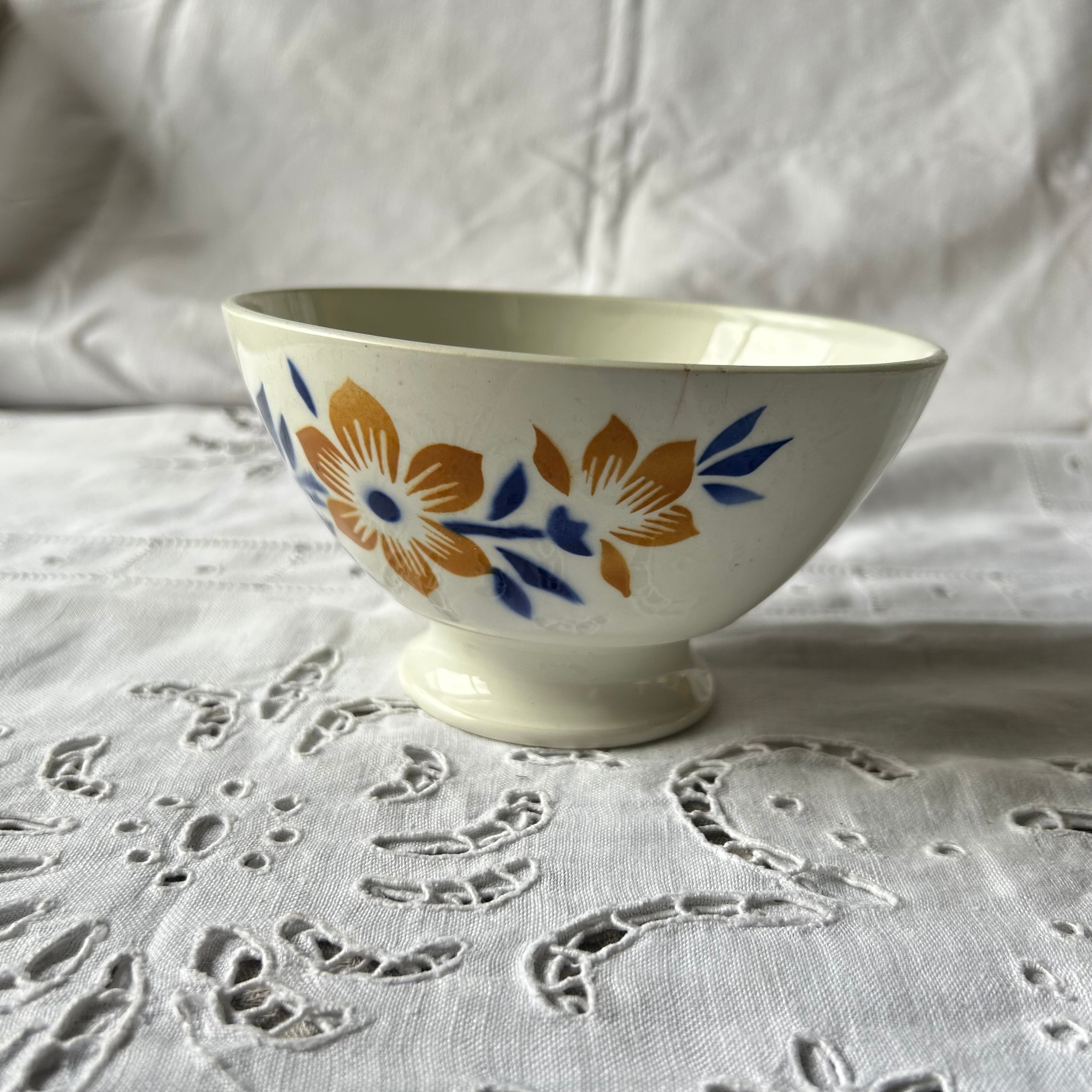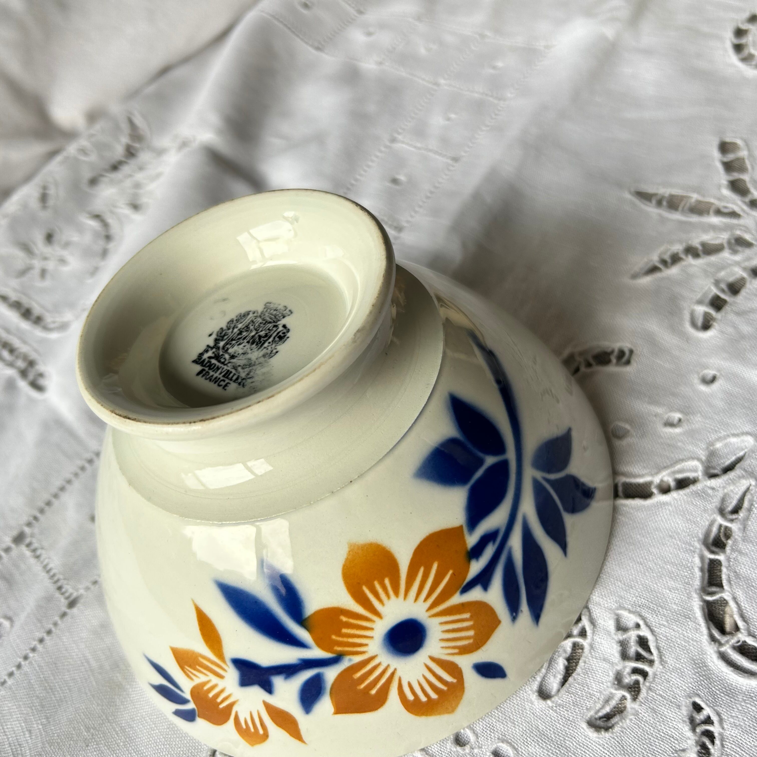 Badonviller ステンシル オレンジ ブルー 大ぶり 花柄 カフェオレボウル フランス アンティーク