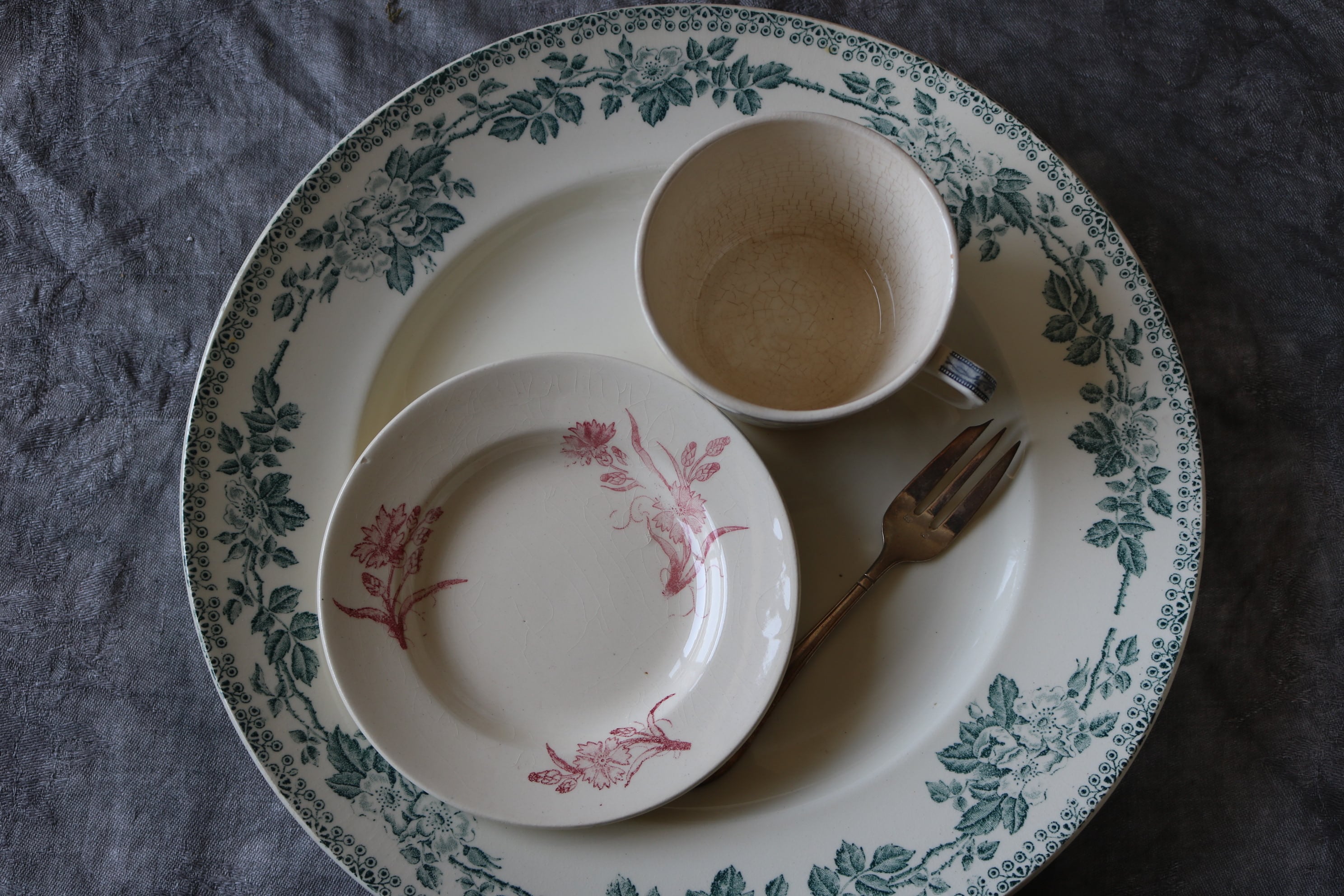 古いものなので、経年による染み、貫入、カトラリー跡、小傷、絵柄の飛び、滲み、焼成時からの傷、釉薬のはげ等ある場合がございます。
