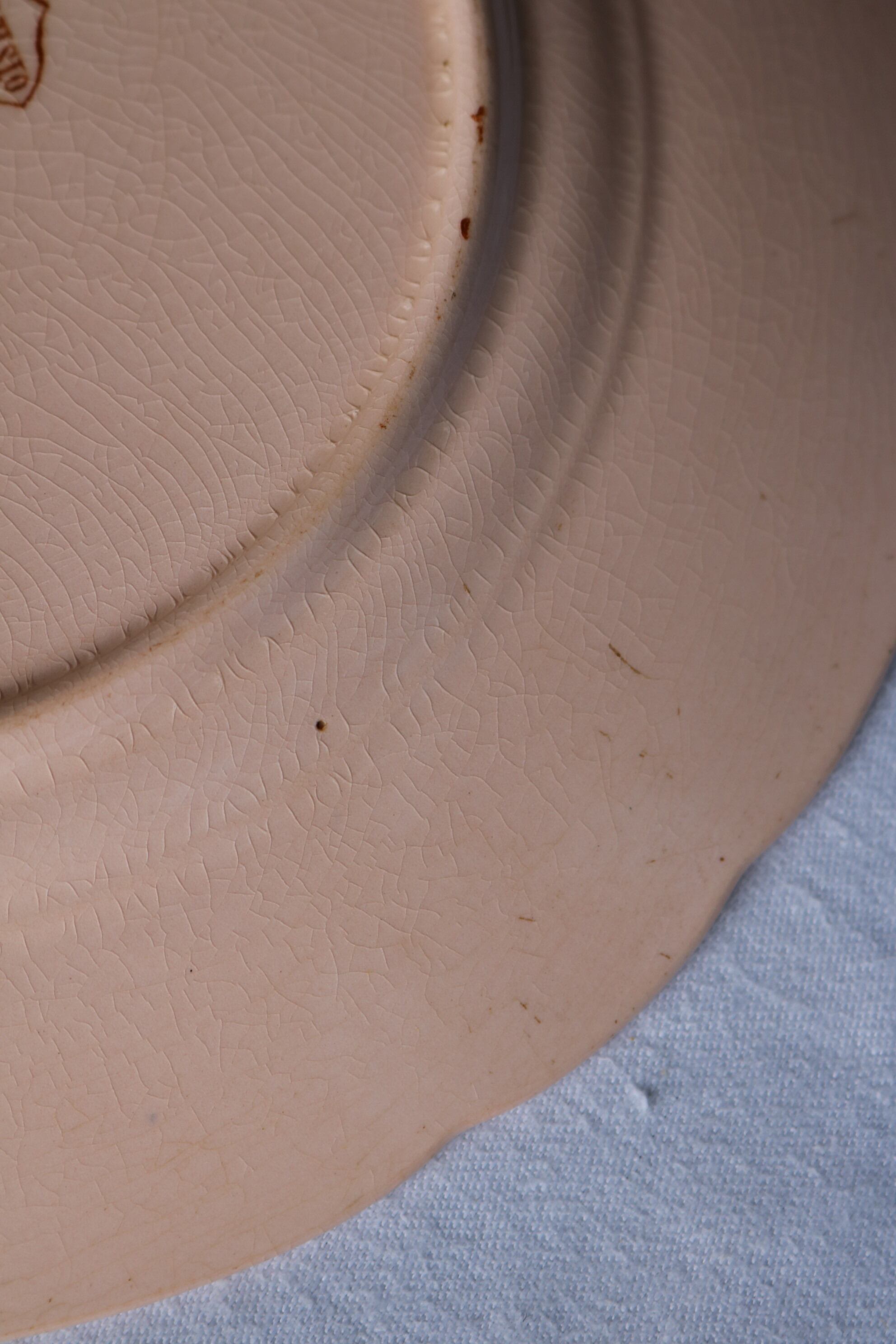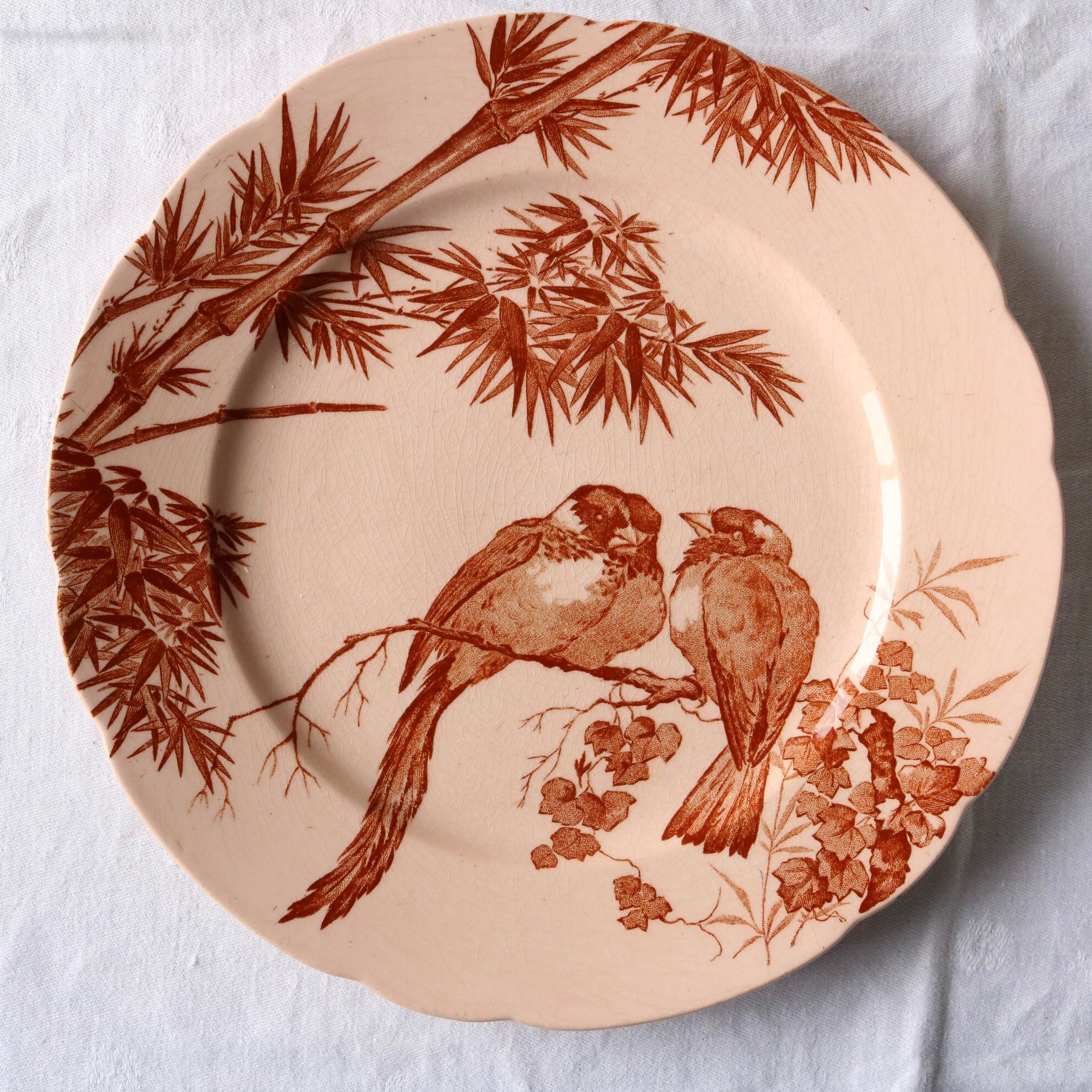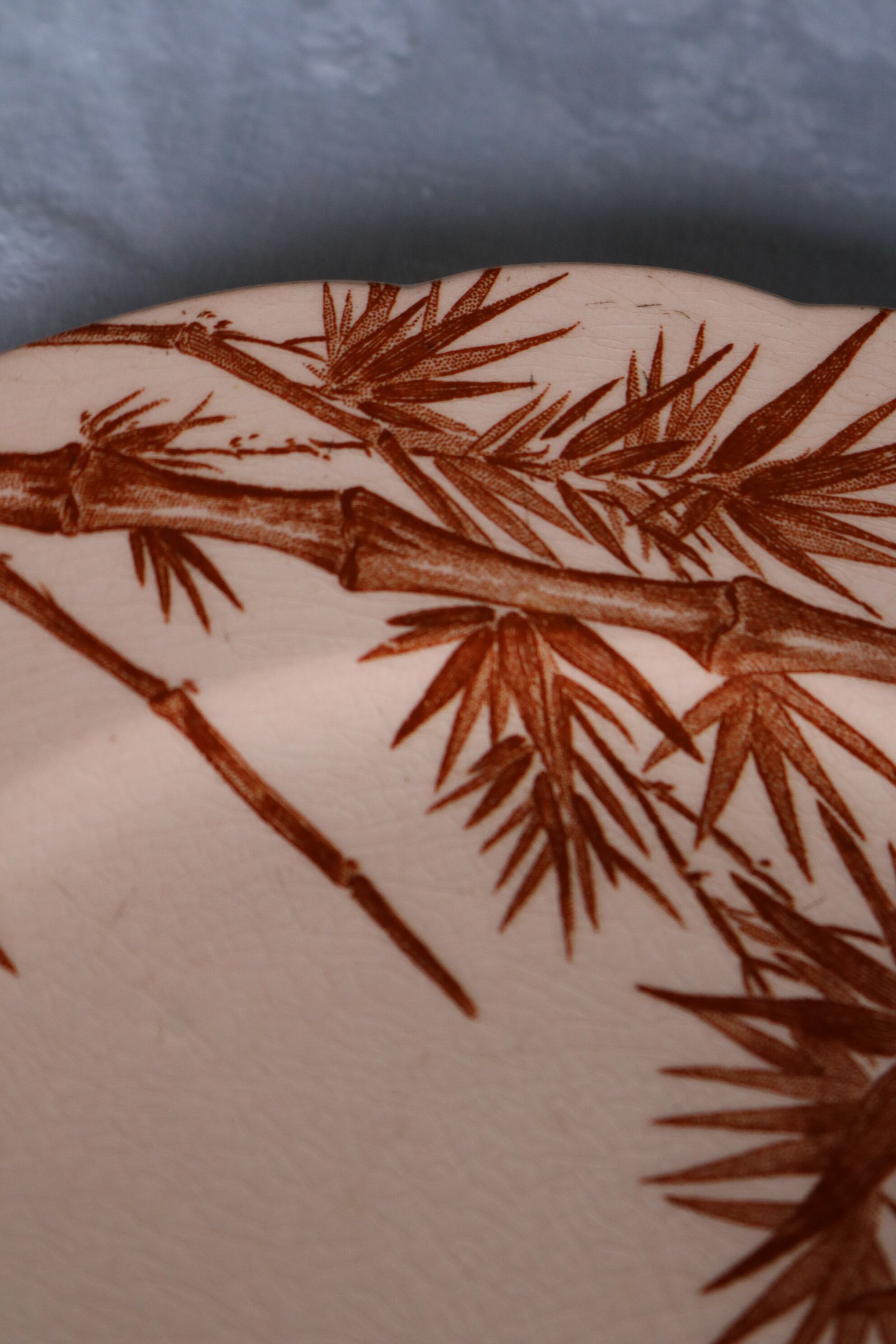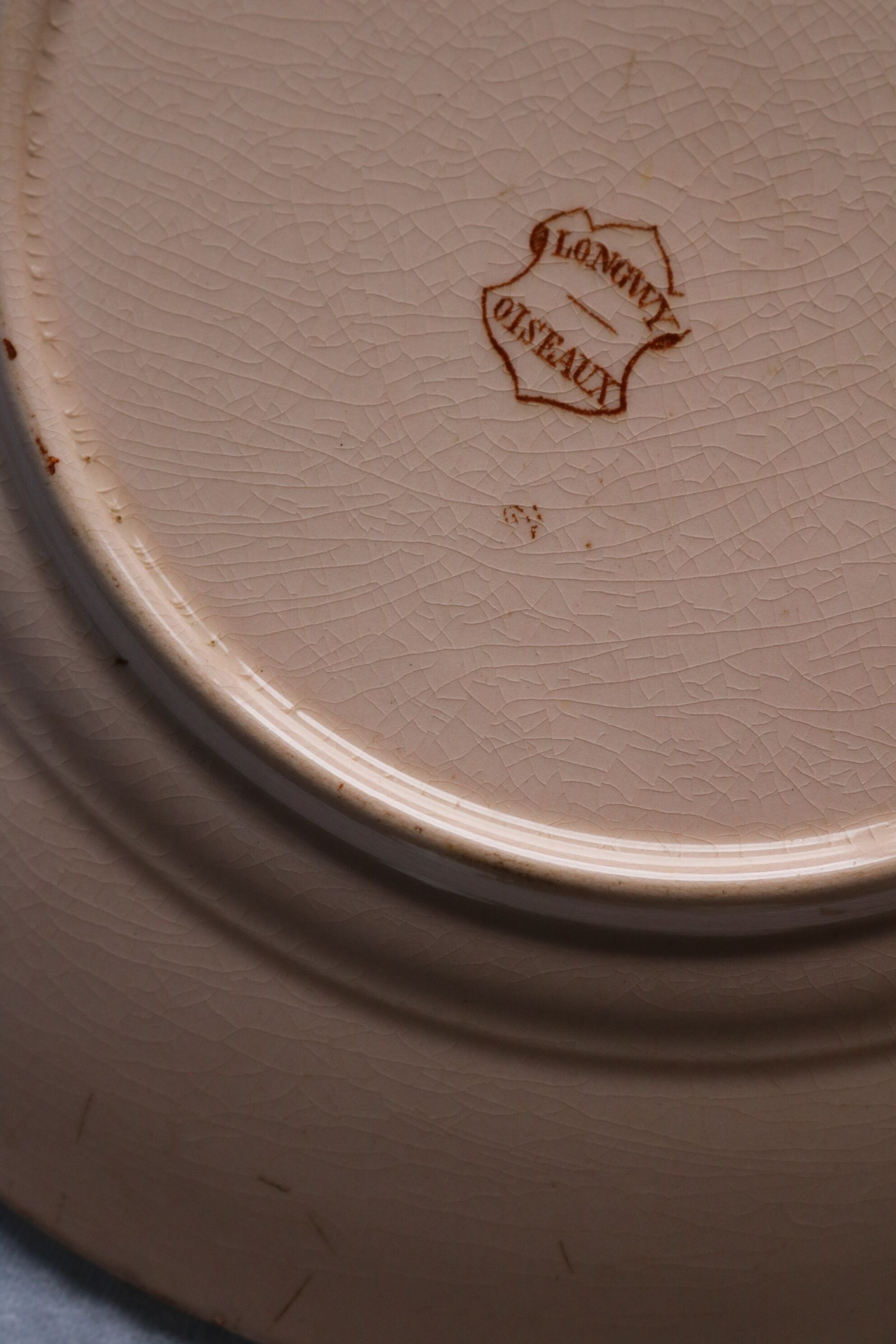 Longwy サーモンピンク 鳥 ジャポニズム 花リム フランス プレートAアンティーク