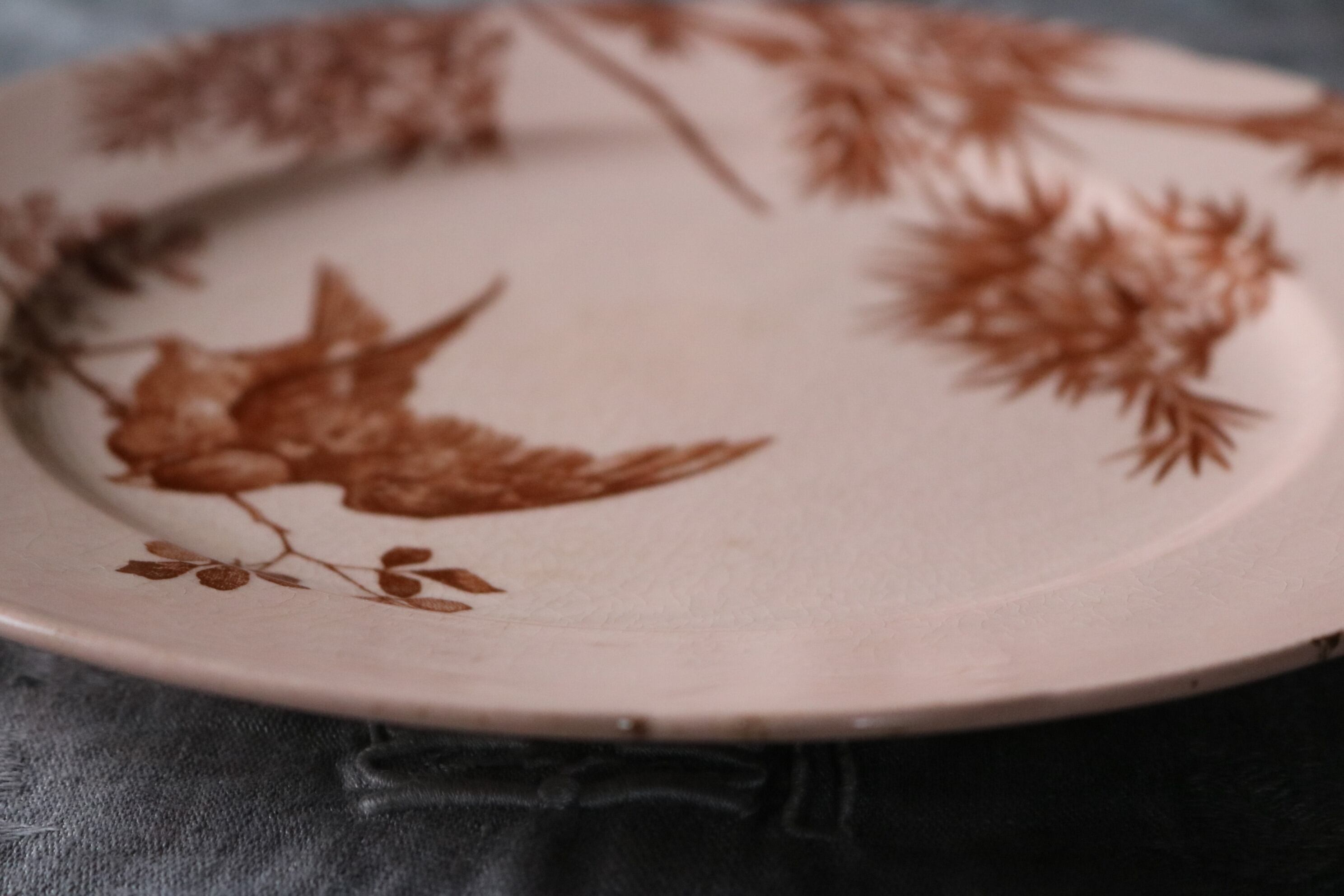 Longwy サーモンピンク 鳥 ジャポニズム 花リム フランス プレートAアンティーク