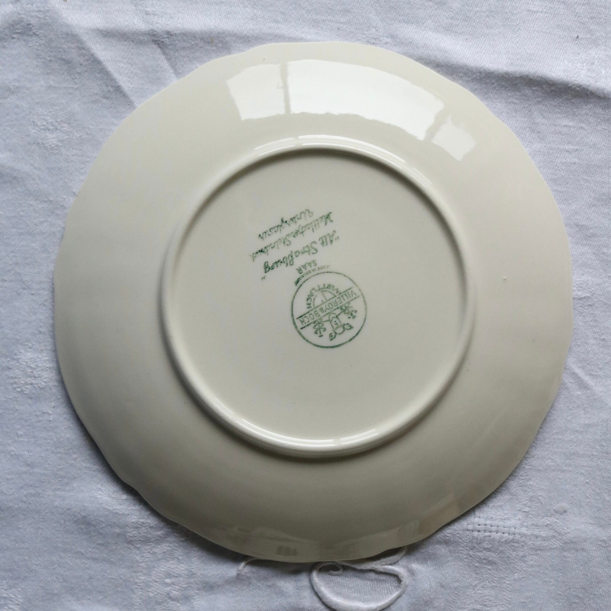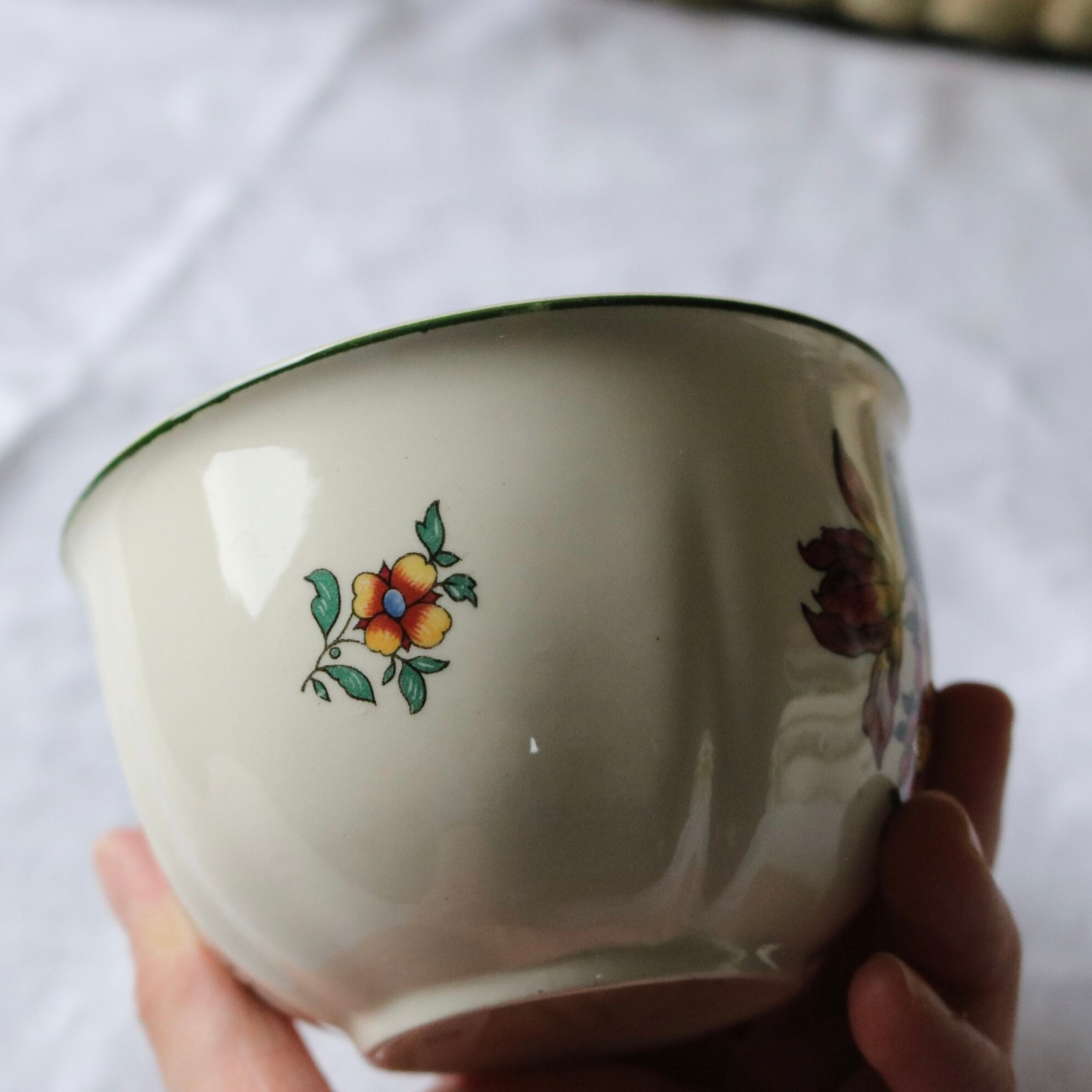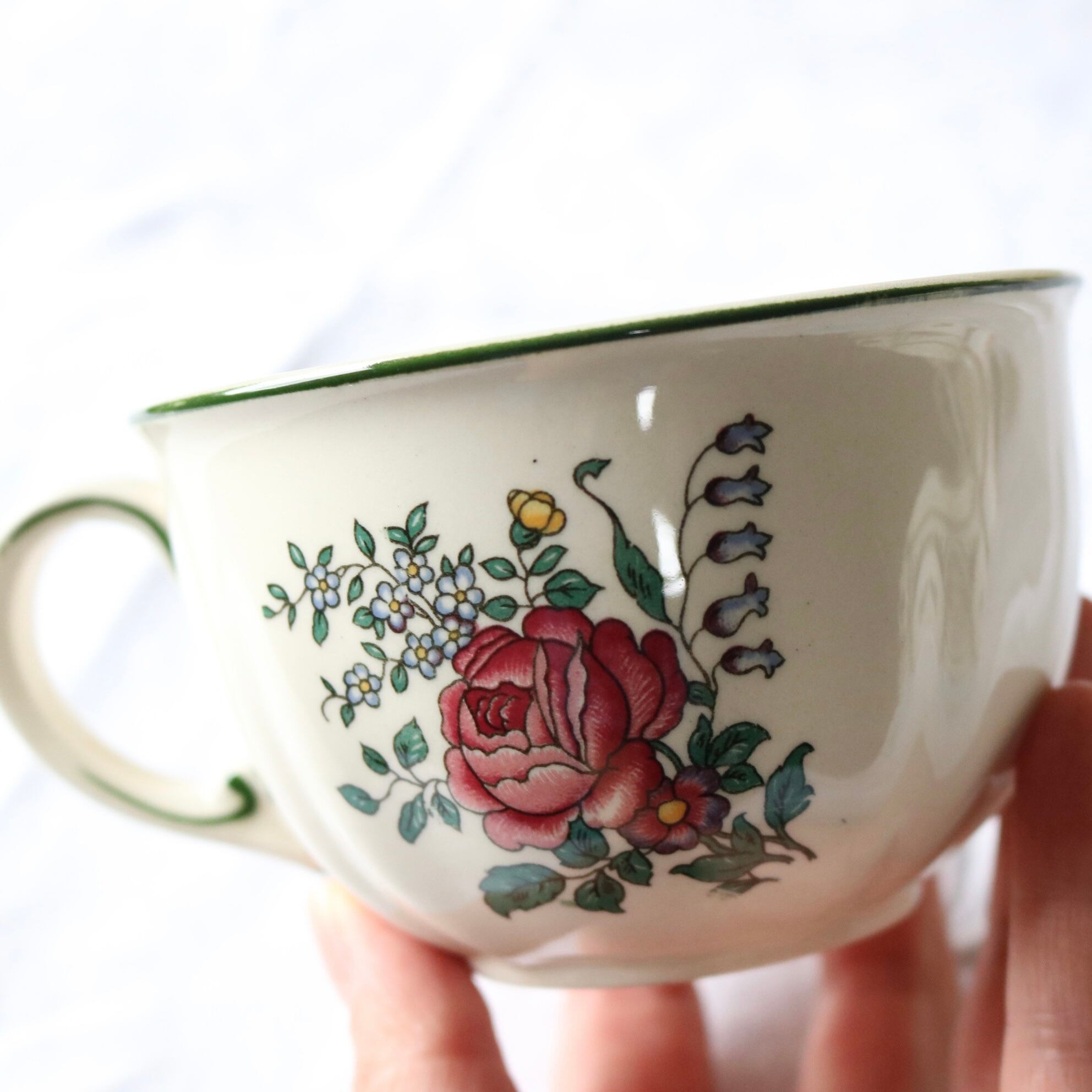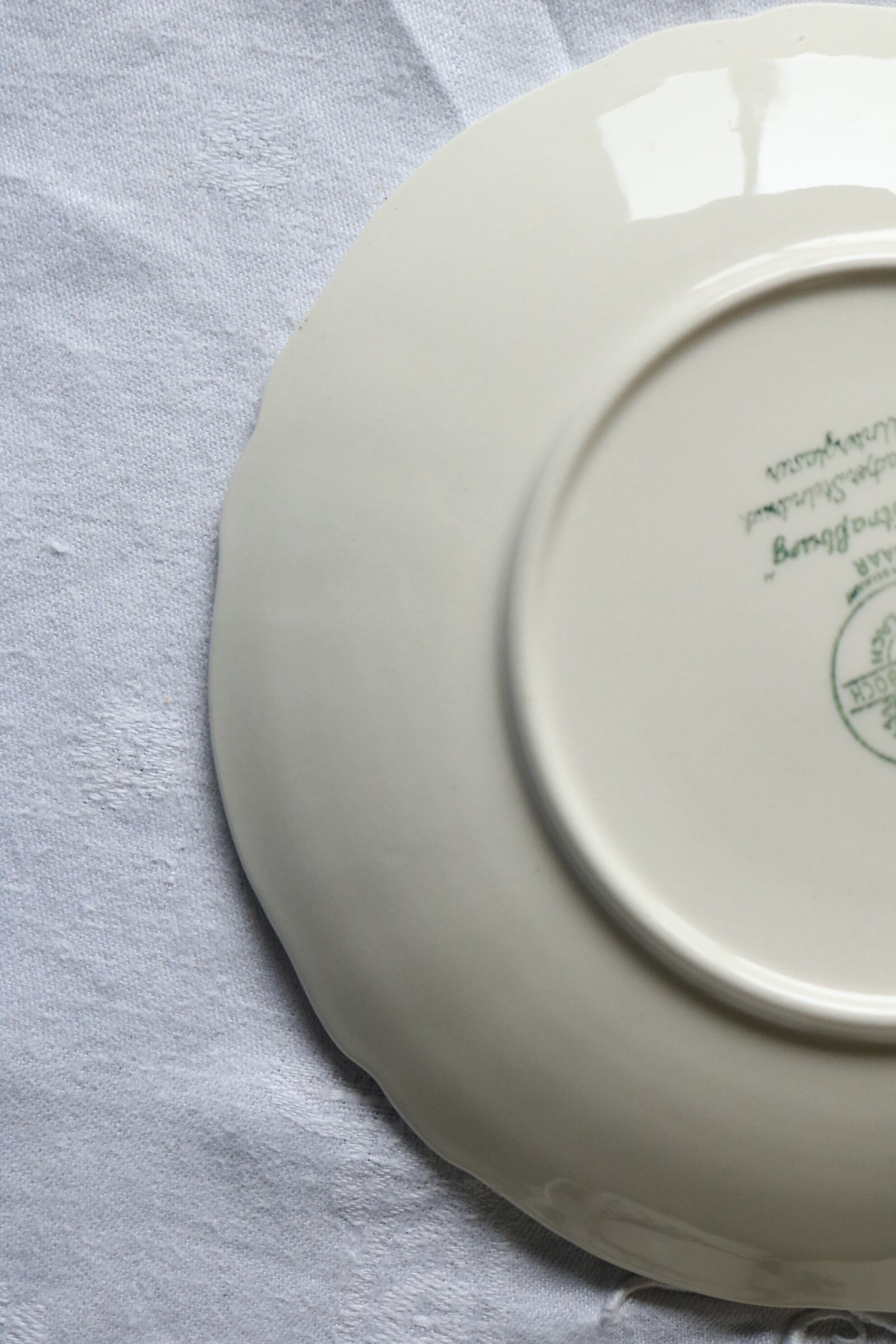 アイボリーの陶肌にくすんだお色味の花柄、縁は深いグリーンです。