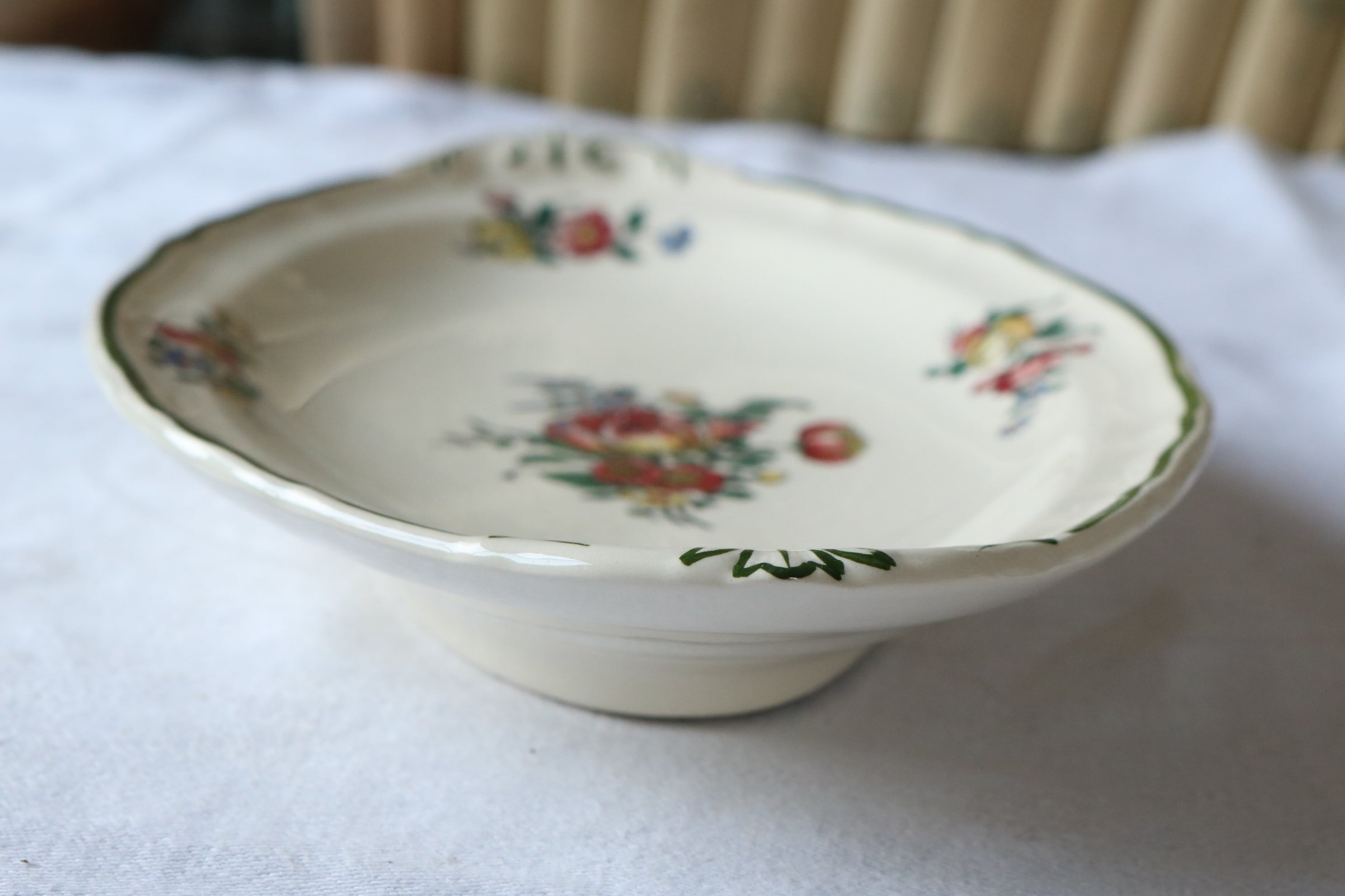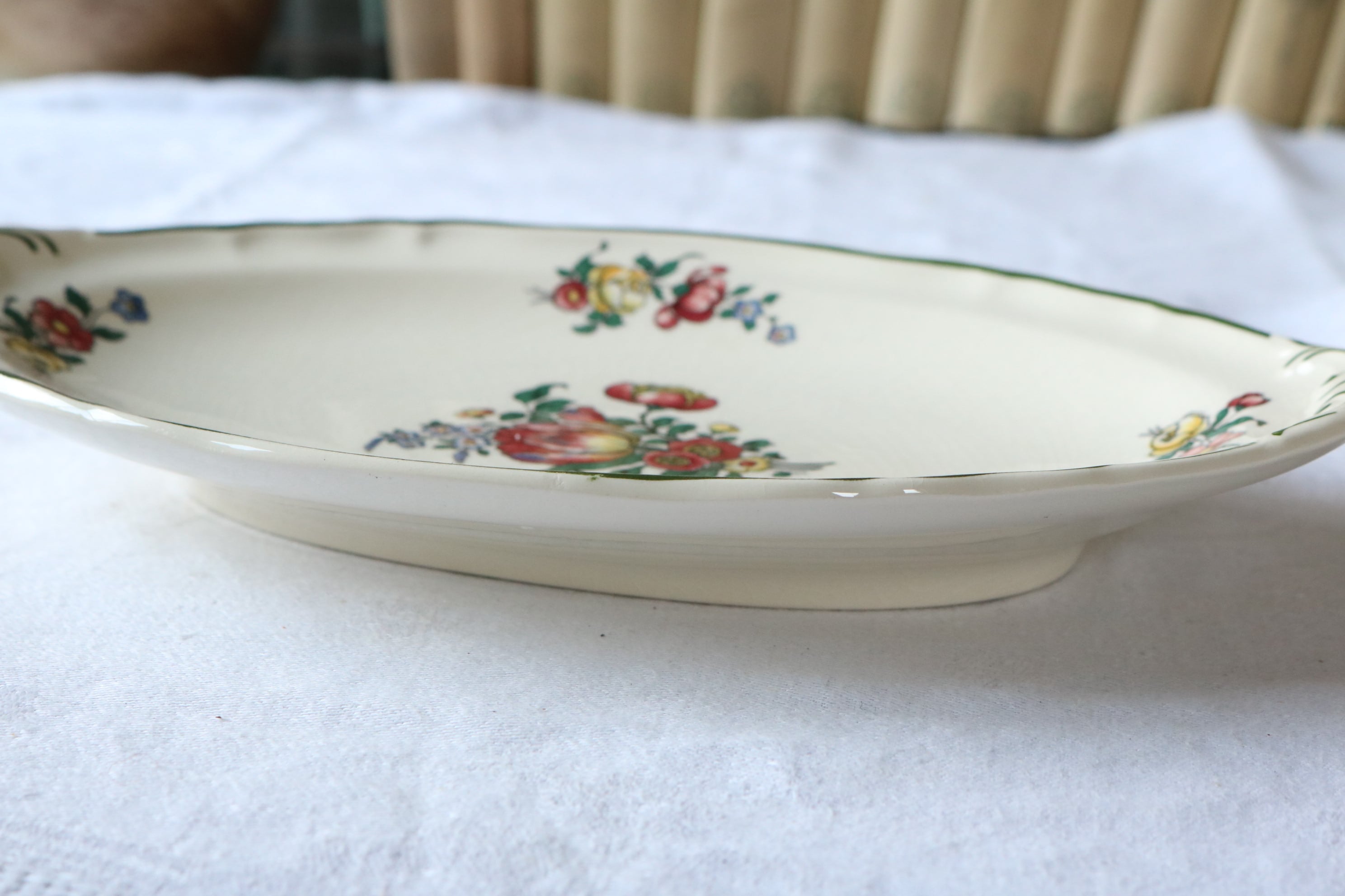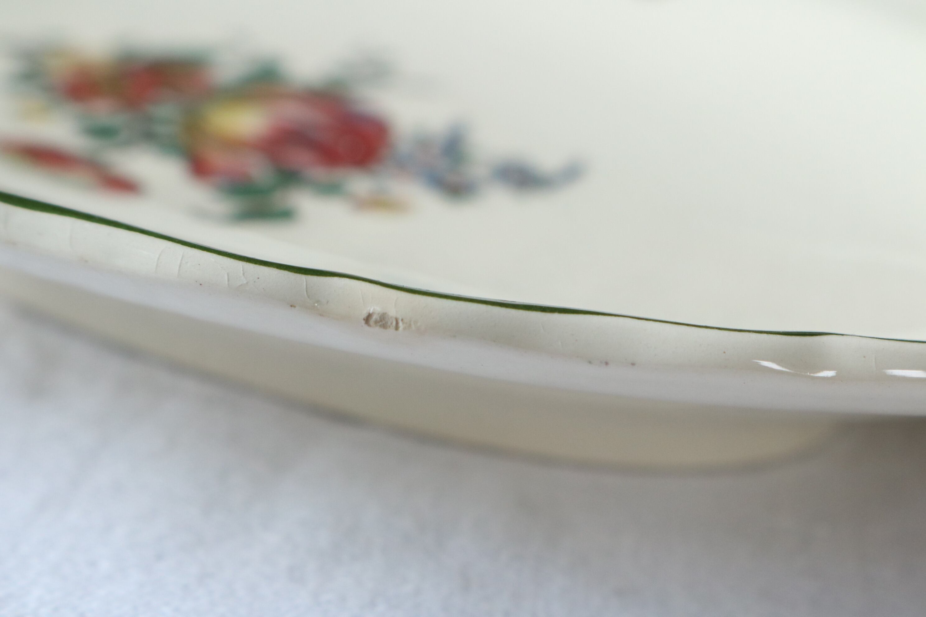 アイボリーの陶肌にくすんだお色味の花柄、縁は深いグリーンです。