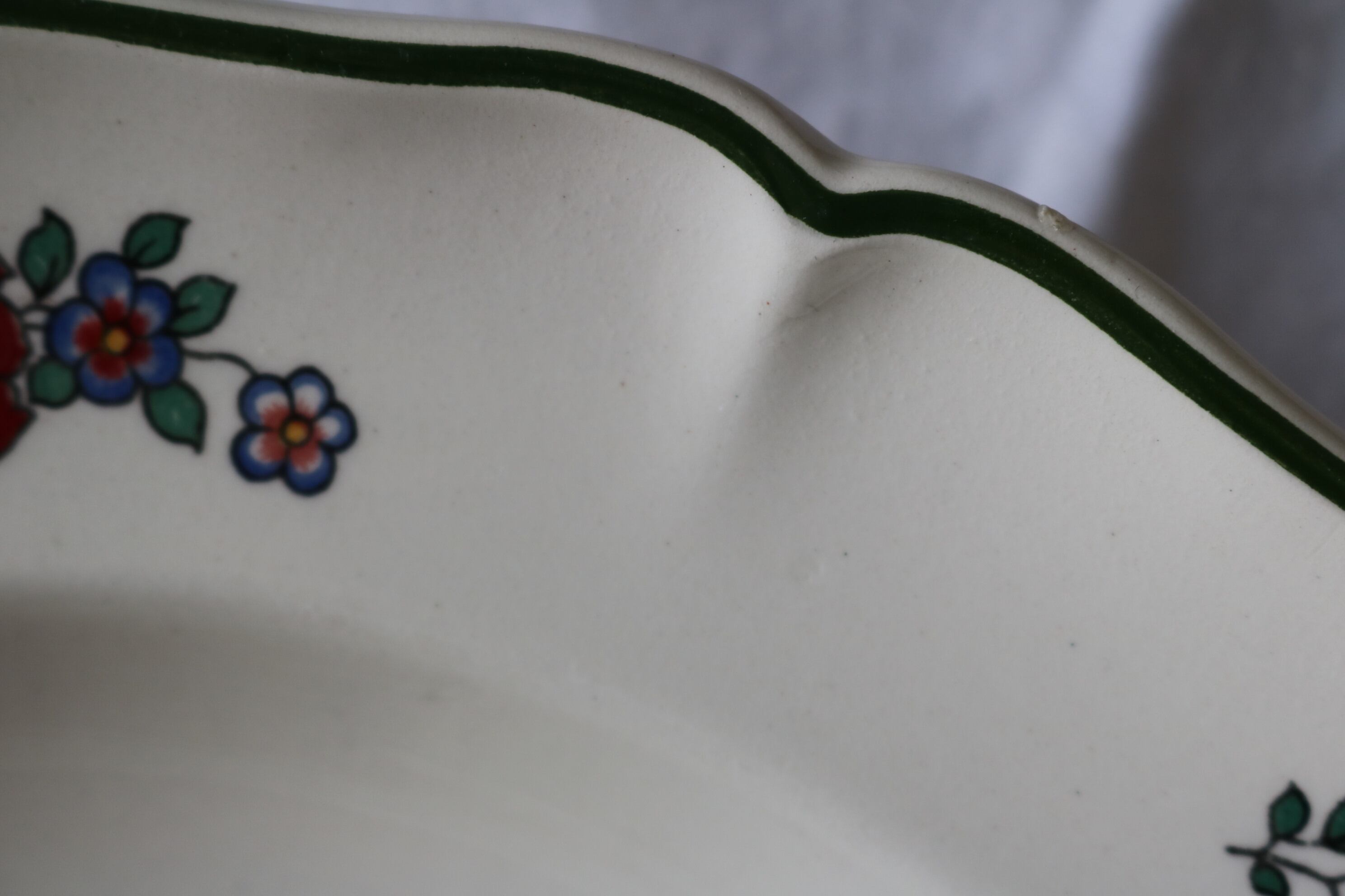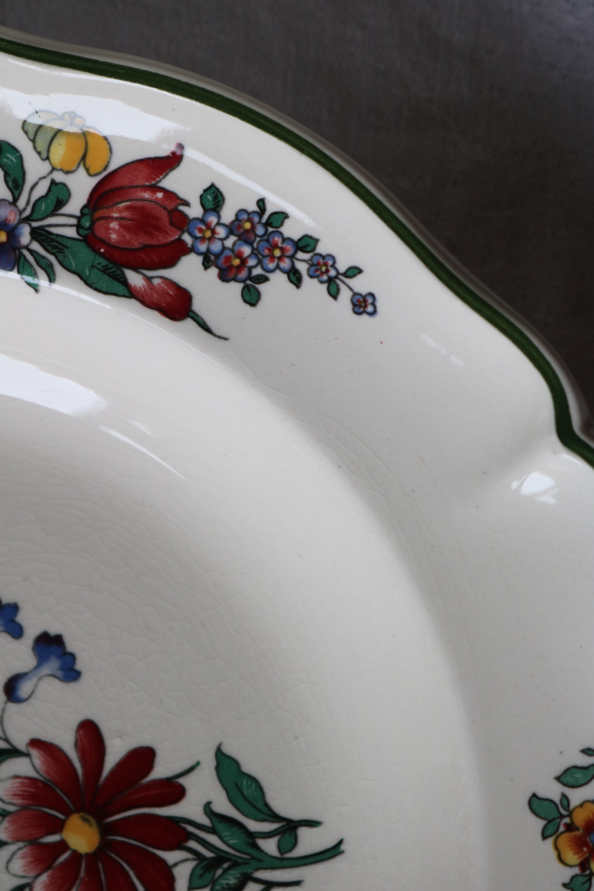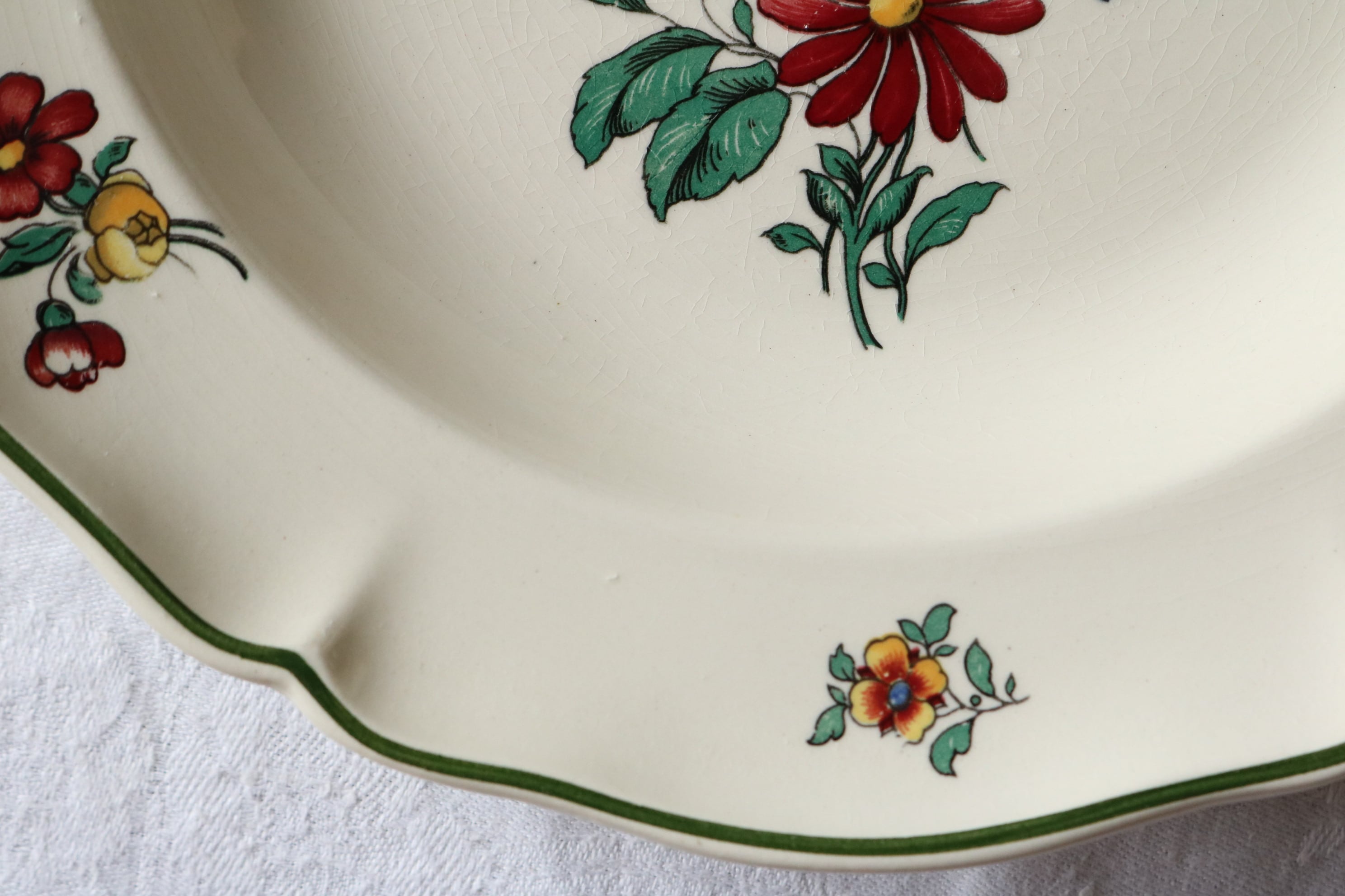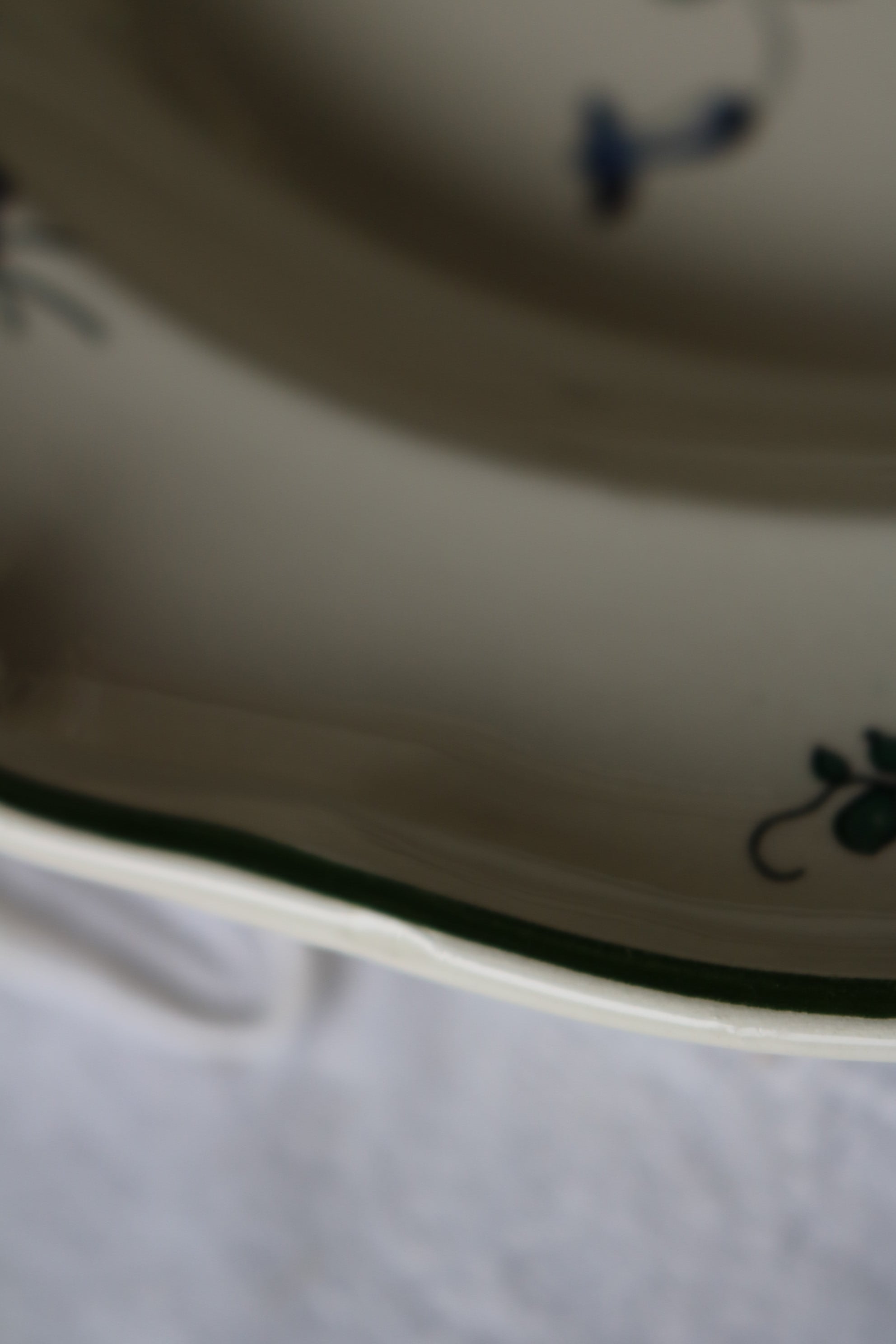アイボリーの陶肌にくすんだお色味の花柄、縁は深いグリーンです。