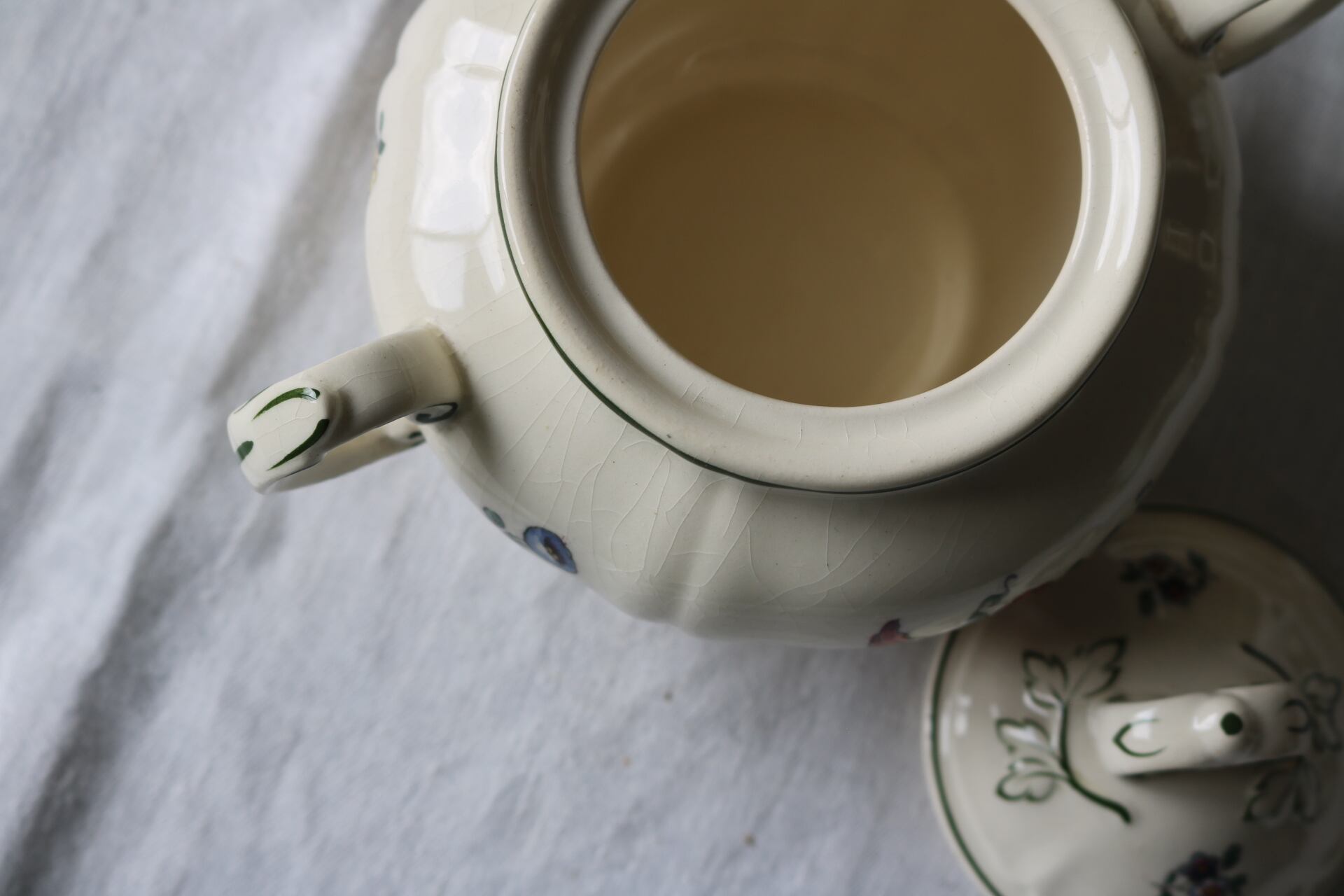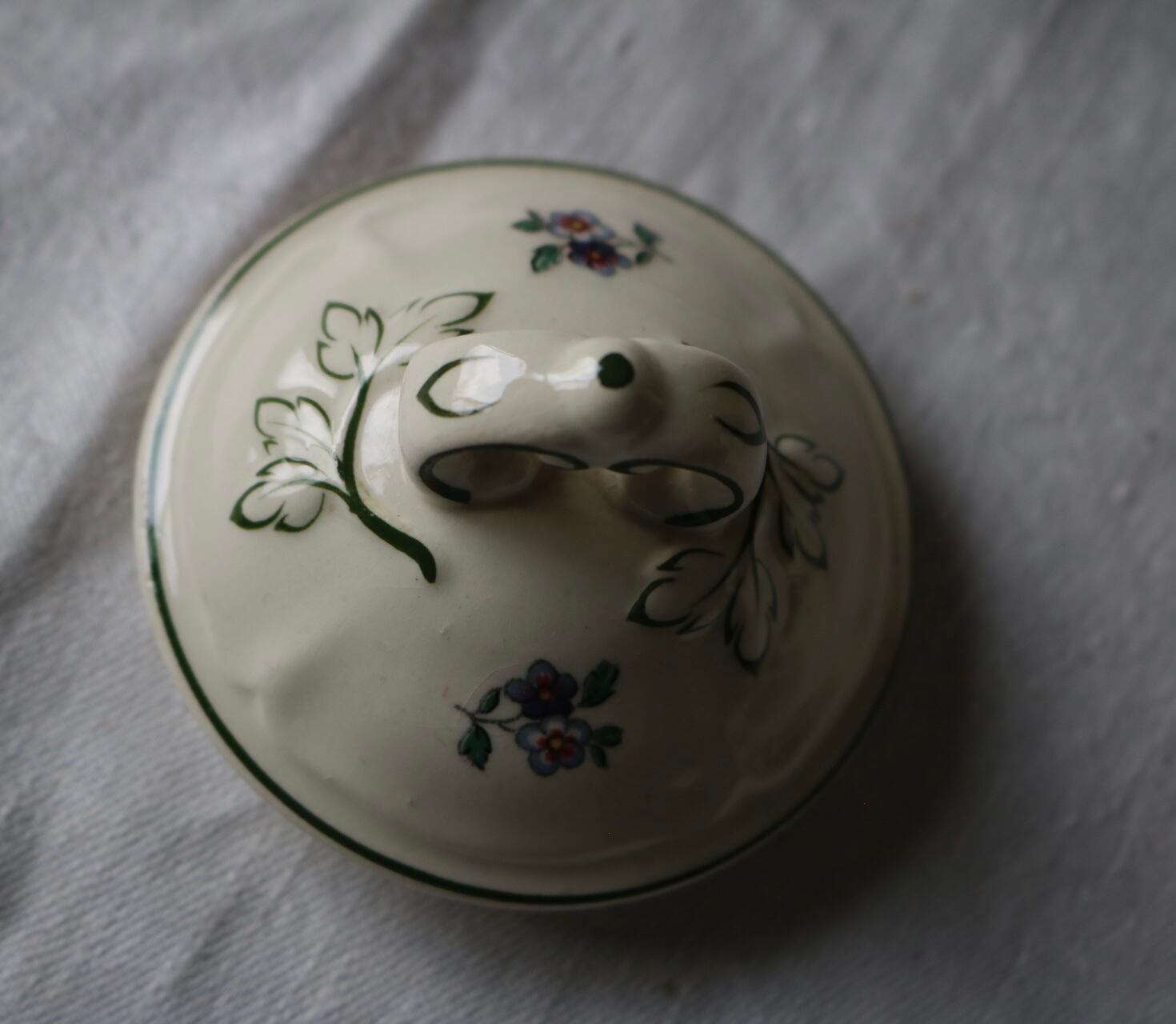 アイボリーの陶肌にくすんだお色味の花柄、縁は深いグリーンです。
