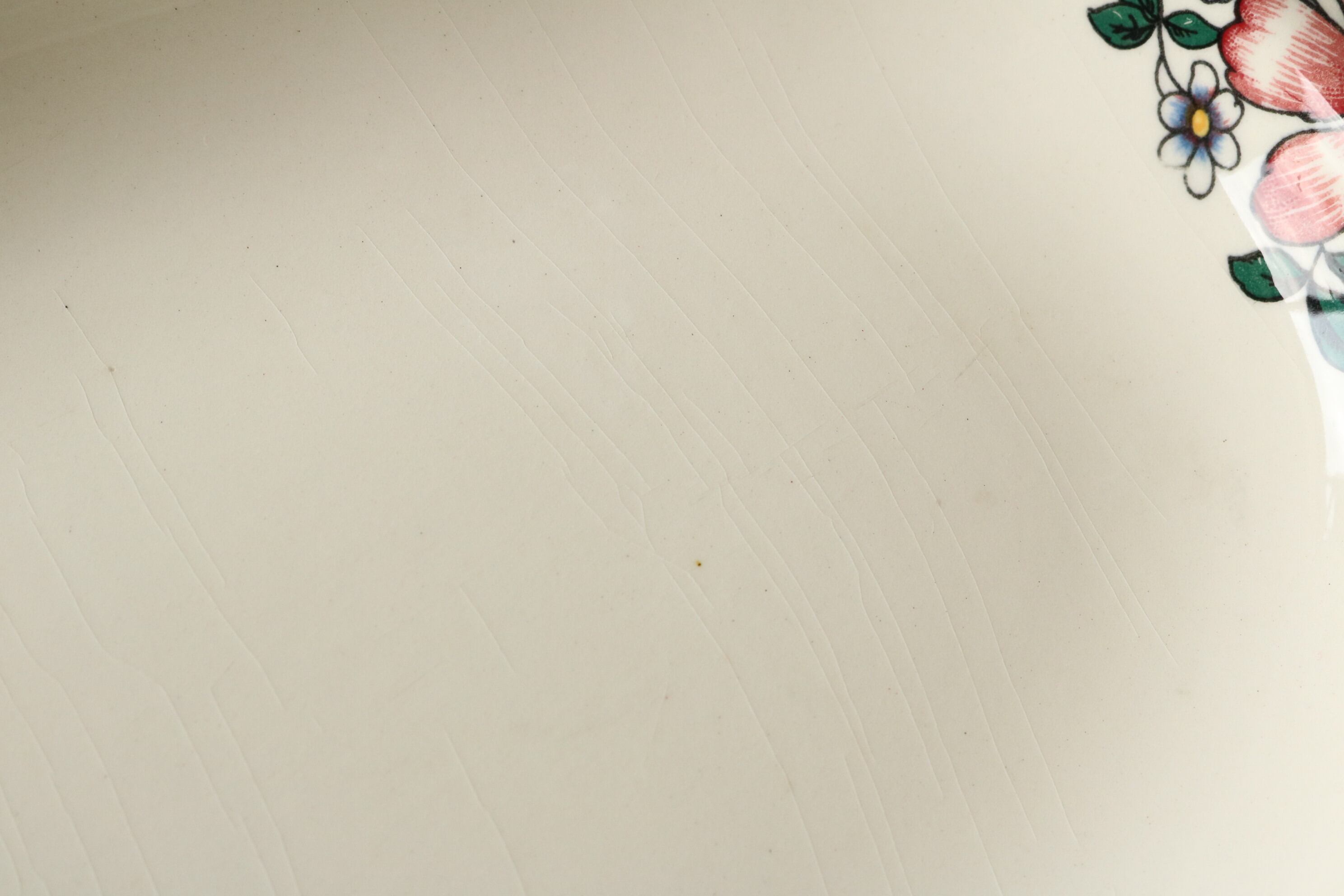 アイボリーの陶肌にくすんだお色味の花柄、縁は深いグリーンです。