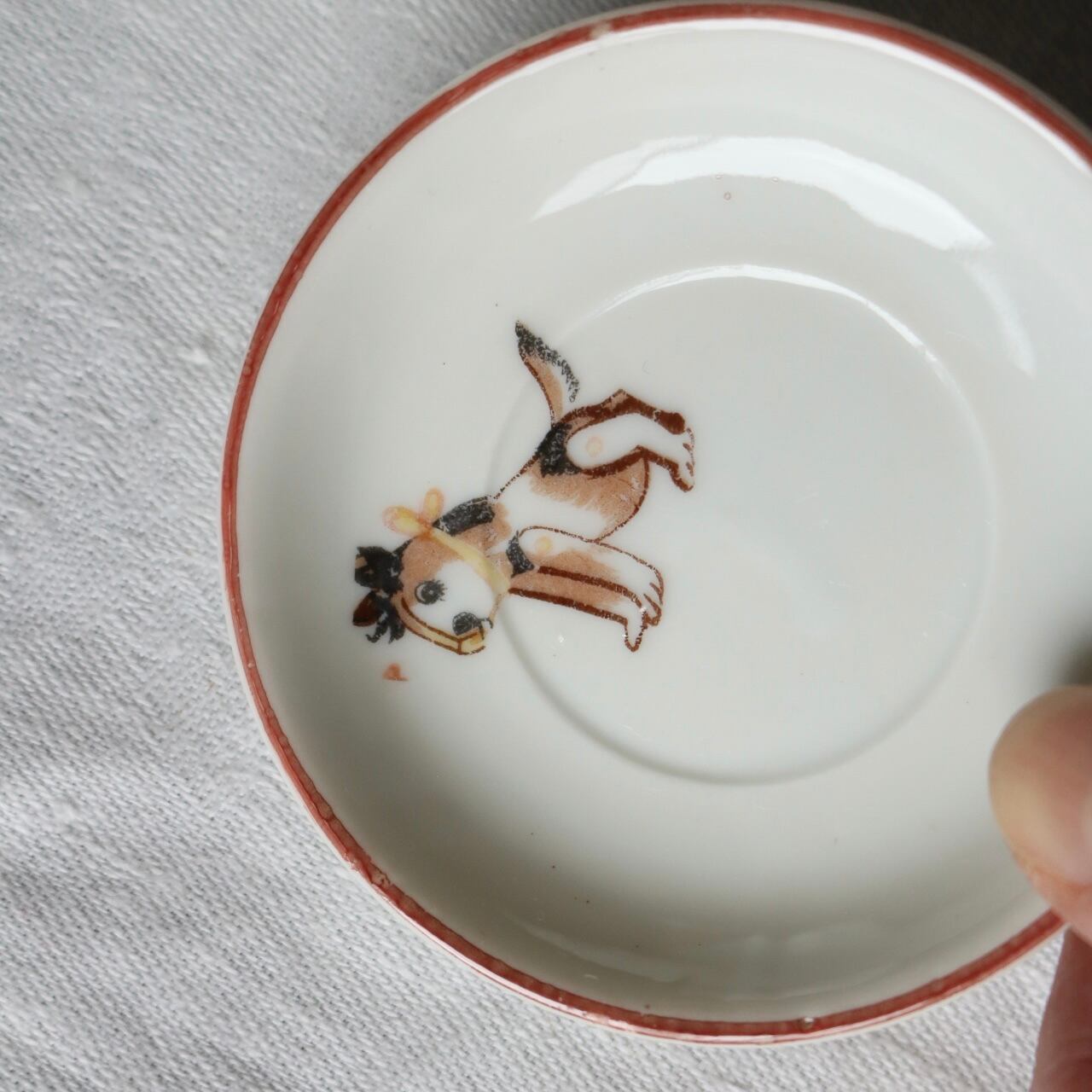 おままごと カップ ソーサー 犬柄 陶器 ポースリンarie Louise 白 カップ & ソーサー c&s ブルーグリーン