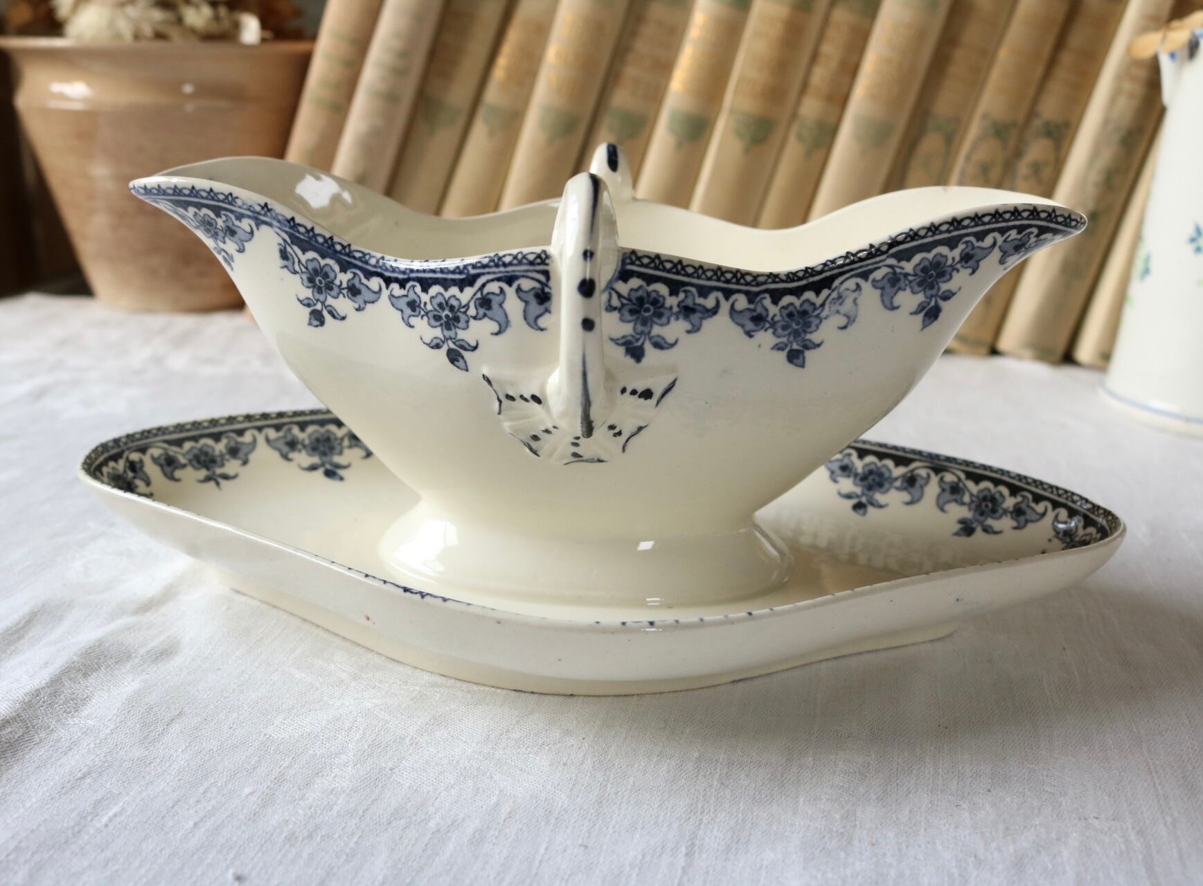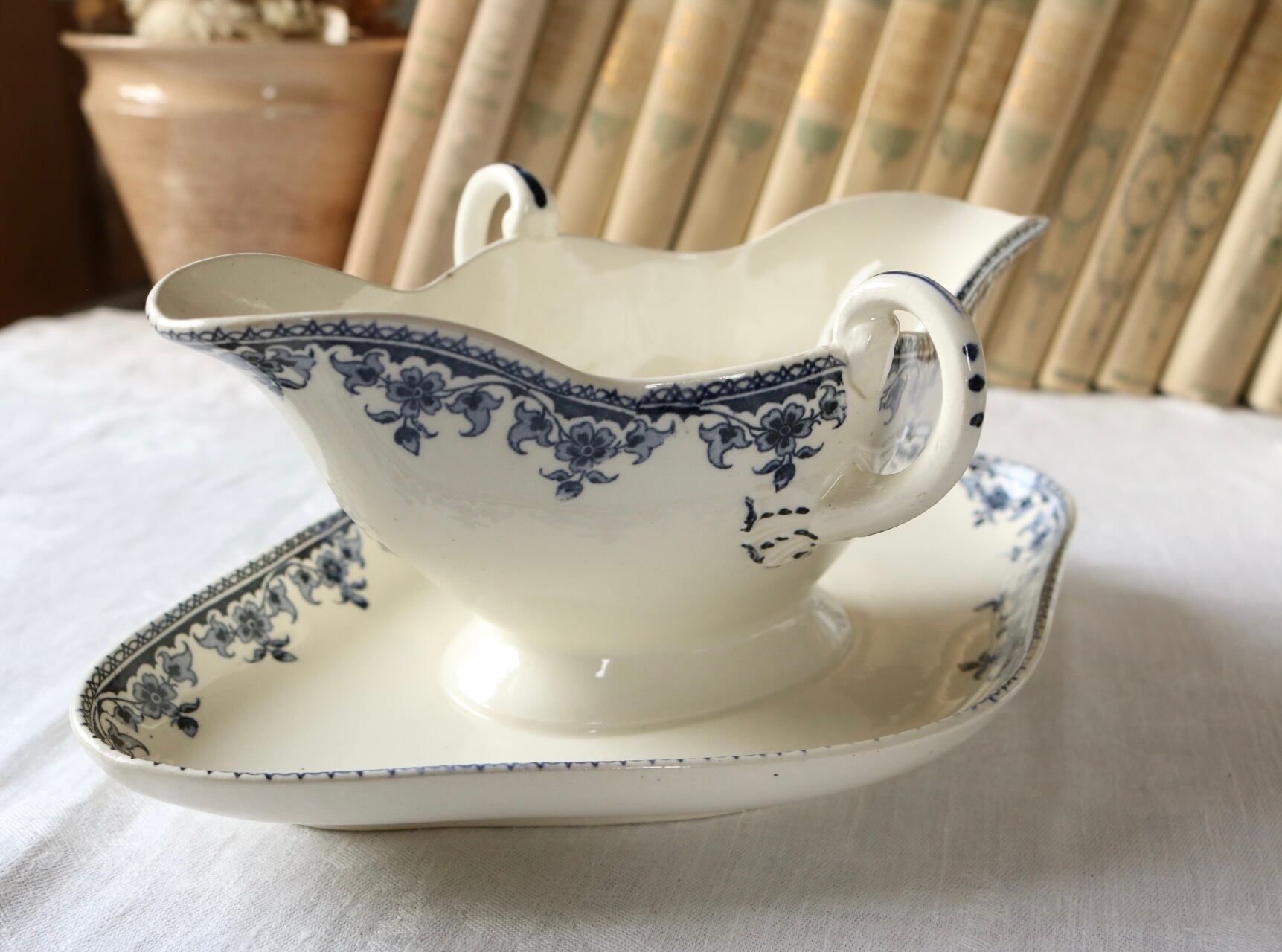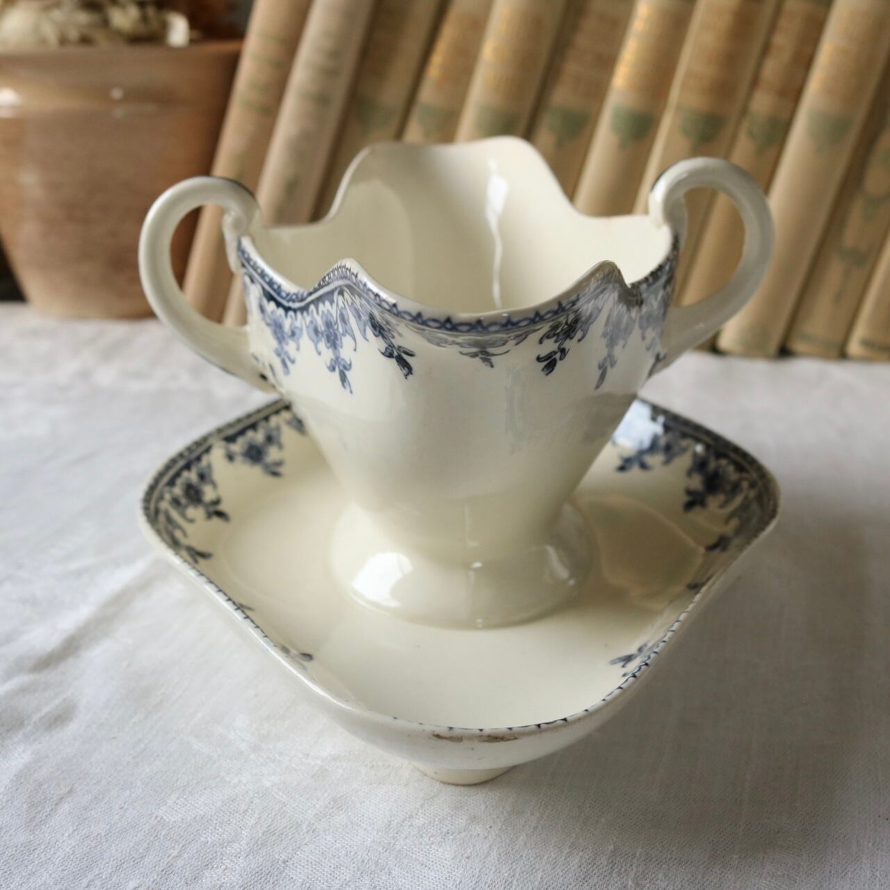 藍色のボタニカルな柄のソーシエールです。
