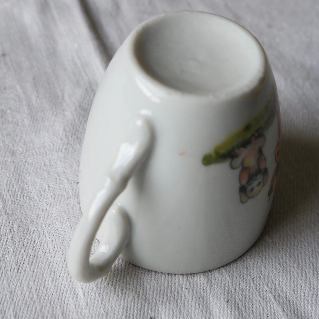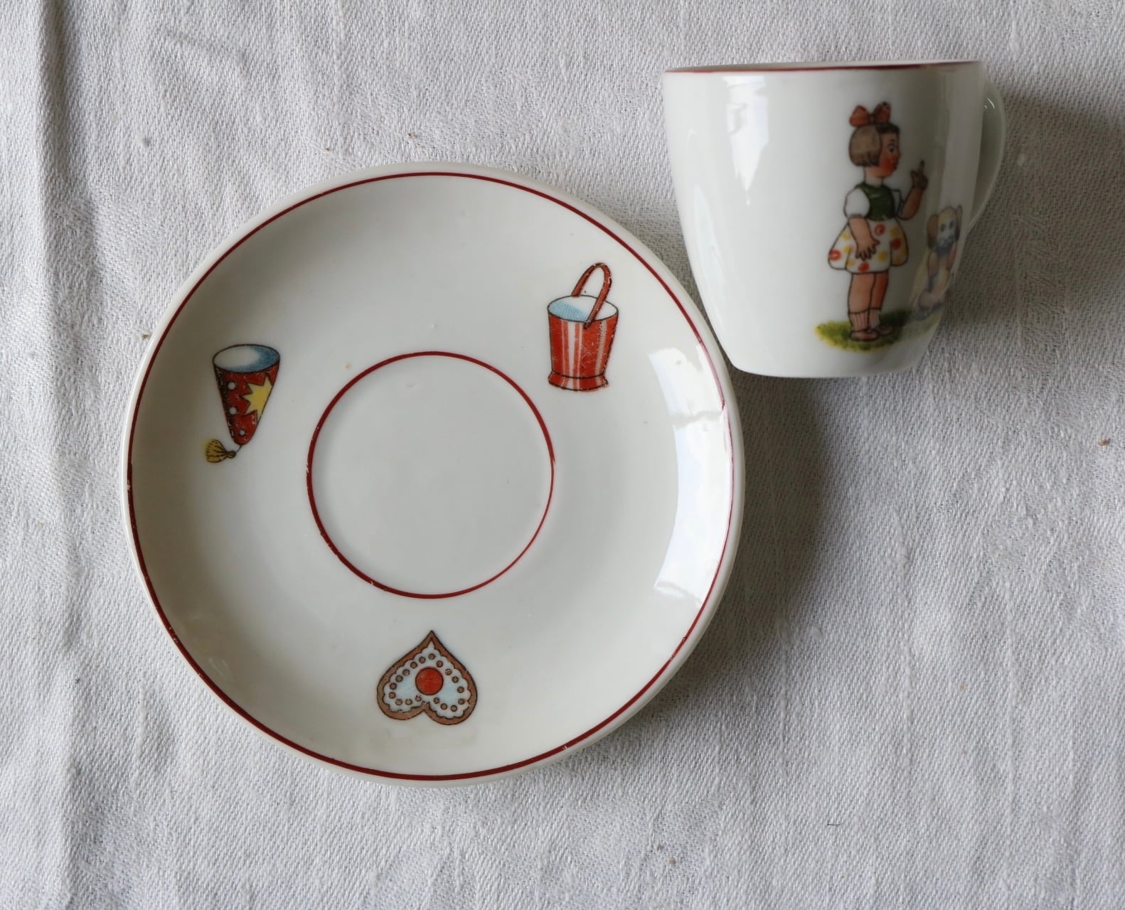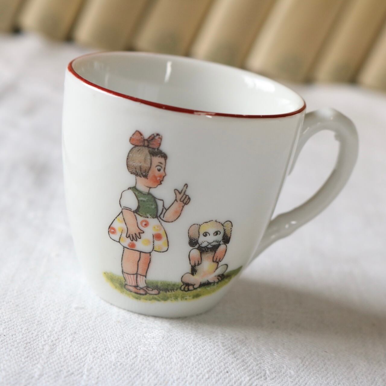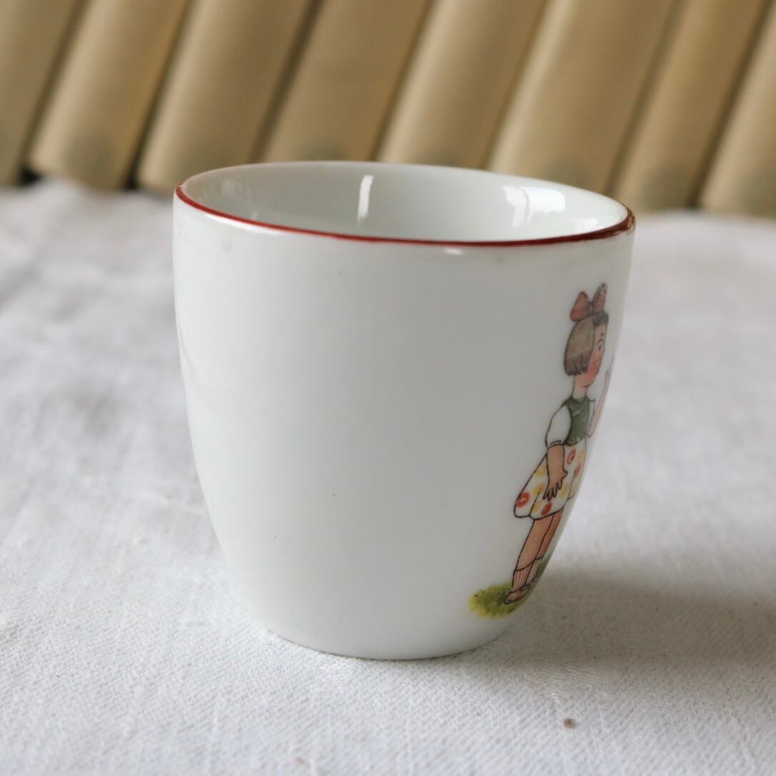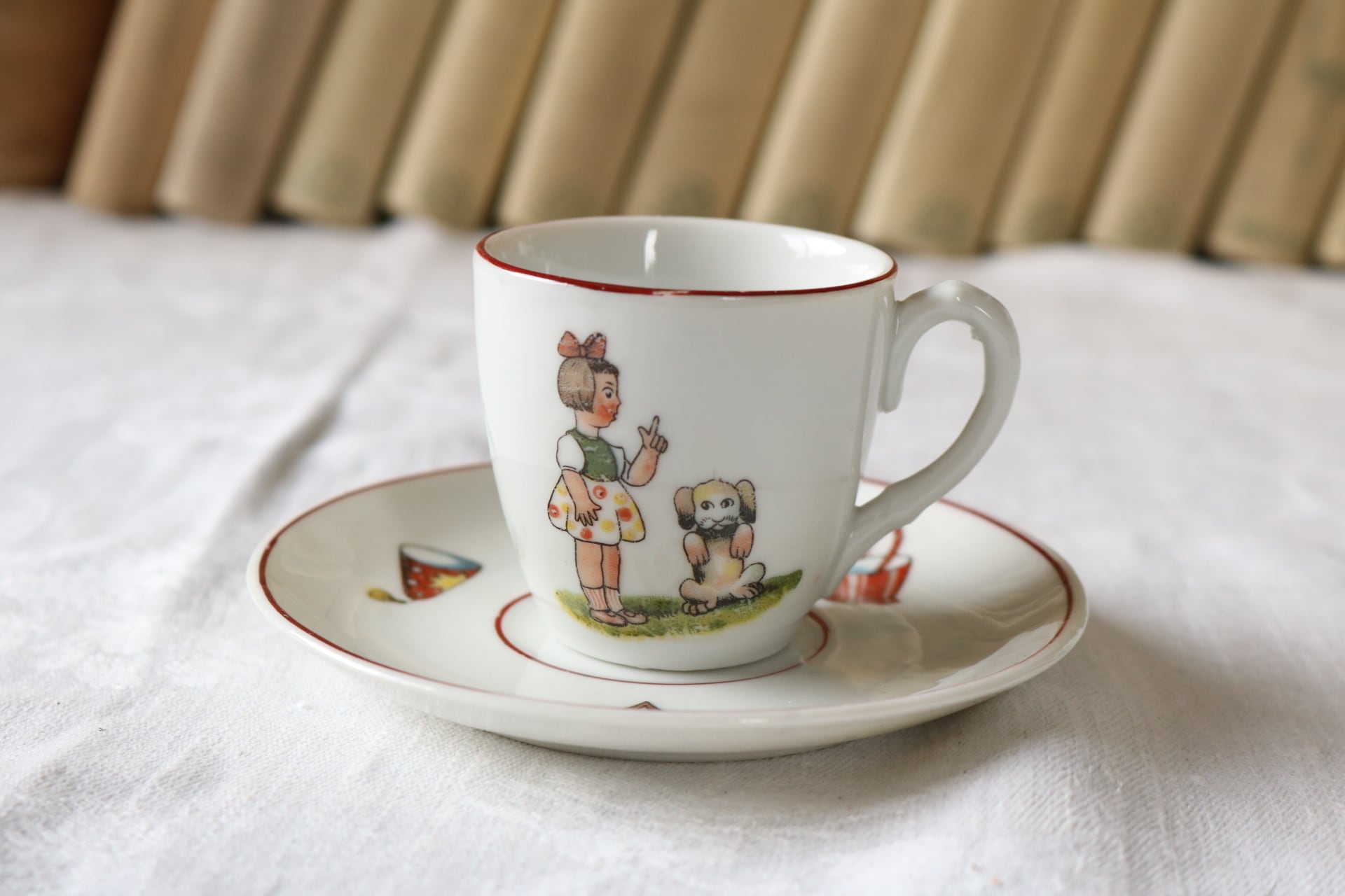 カップ、ソーサーそれぞれに犬を躾ける女の子やお菓子、帽子などの可愛らしいイラストが入っています。