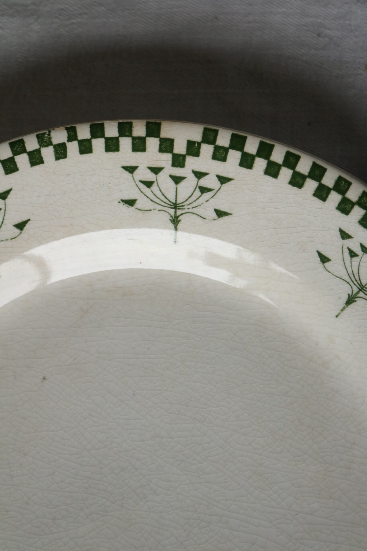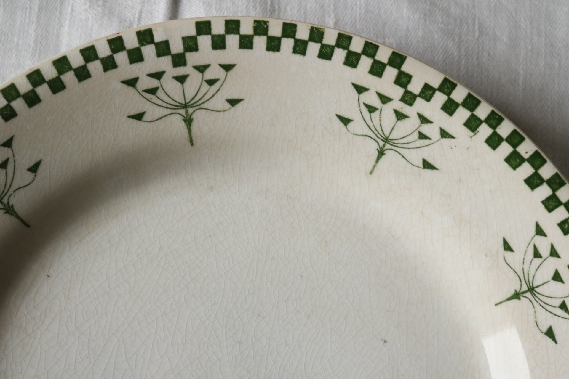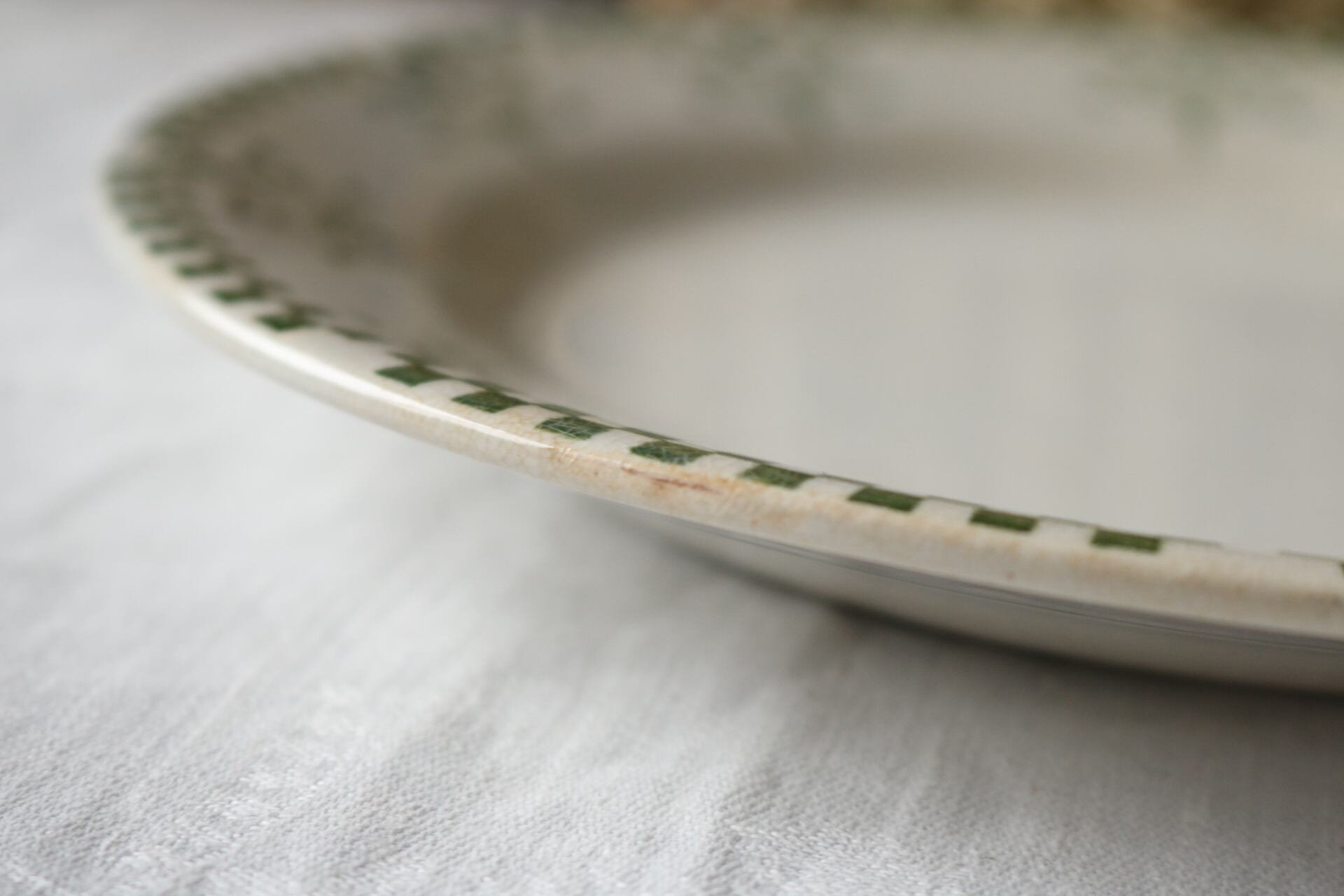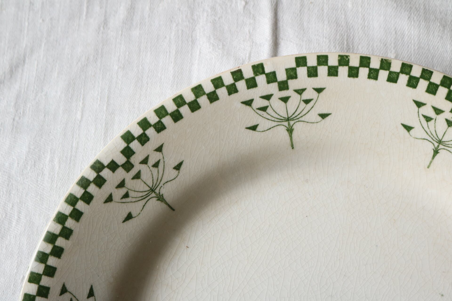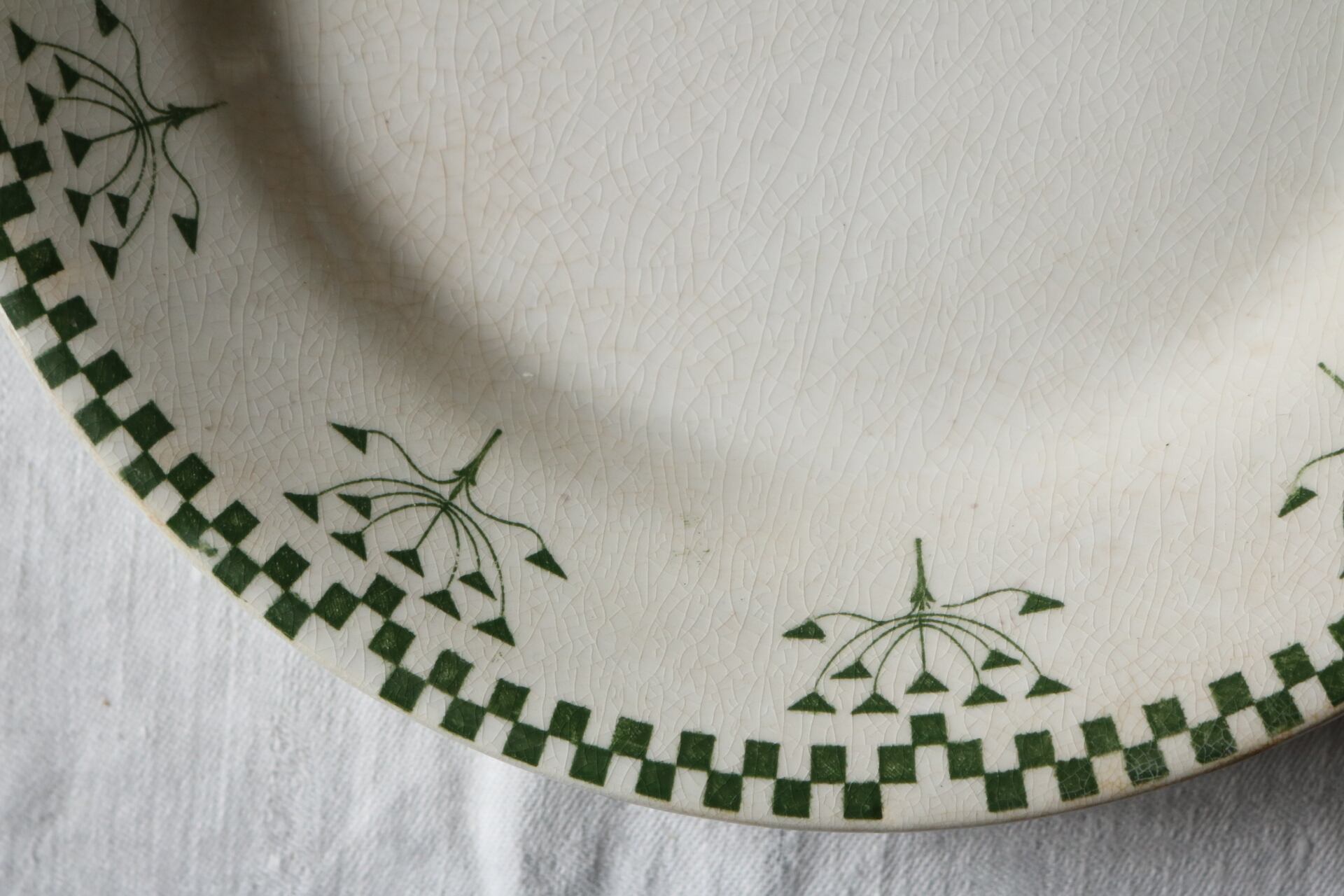 Creil montereau モスグリーン ダミエ 幾何学模様 プレート フランス アンティーク
